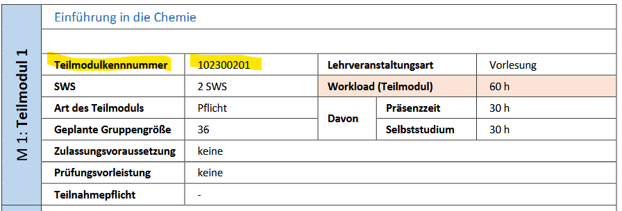 - Modulprüfungs- und/oder Teilmodulkennnummer, einsehbar im Modulkatalog oder über die Detailansicht der Veranstaltung im Studiport