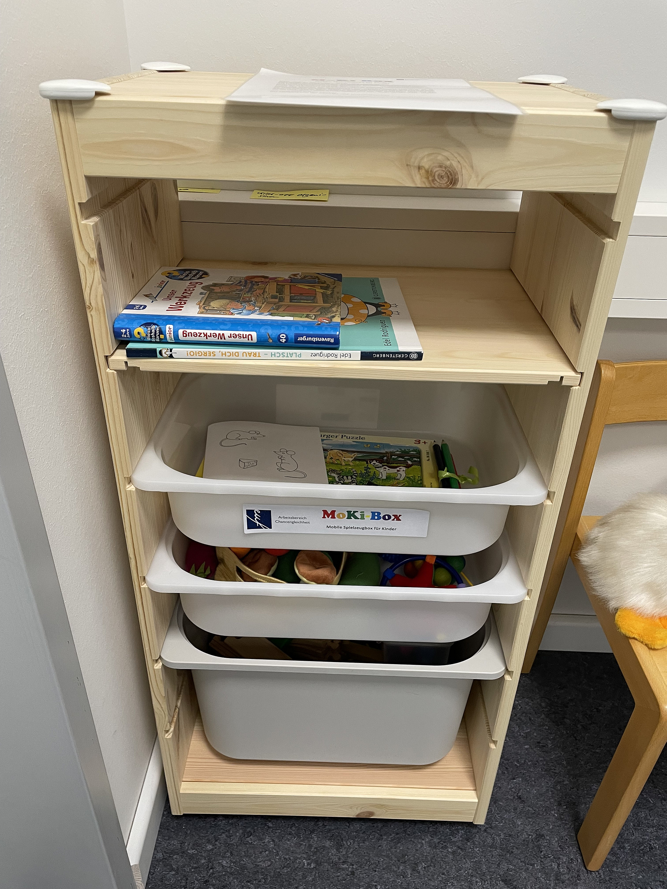 Wenn der Tagesvater krank ist oder die Kita streikt, ist es oftmals schwierig, eine kurzfristige Kinderbetreuung zu organisieren. Um in solchen Fällen eine Kinderbetreuung auf dem Campus zu ermöglichen, gibt es in fast allen Gebäuden der Universität mobile Spielzeugboxen, kurz "MoKi". Die Boxen sind mit Spiel- und Beschäftigungsmöglichkeiten für verschiedene Altersklassen sowie mit einer Turnmatte ausgestattet und sind durch Rollen mobil.