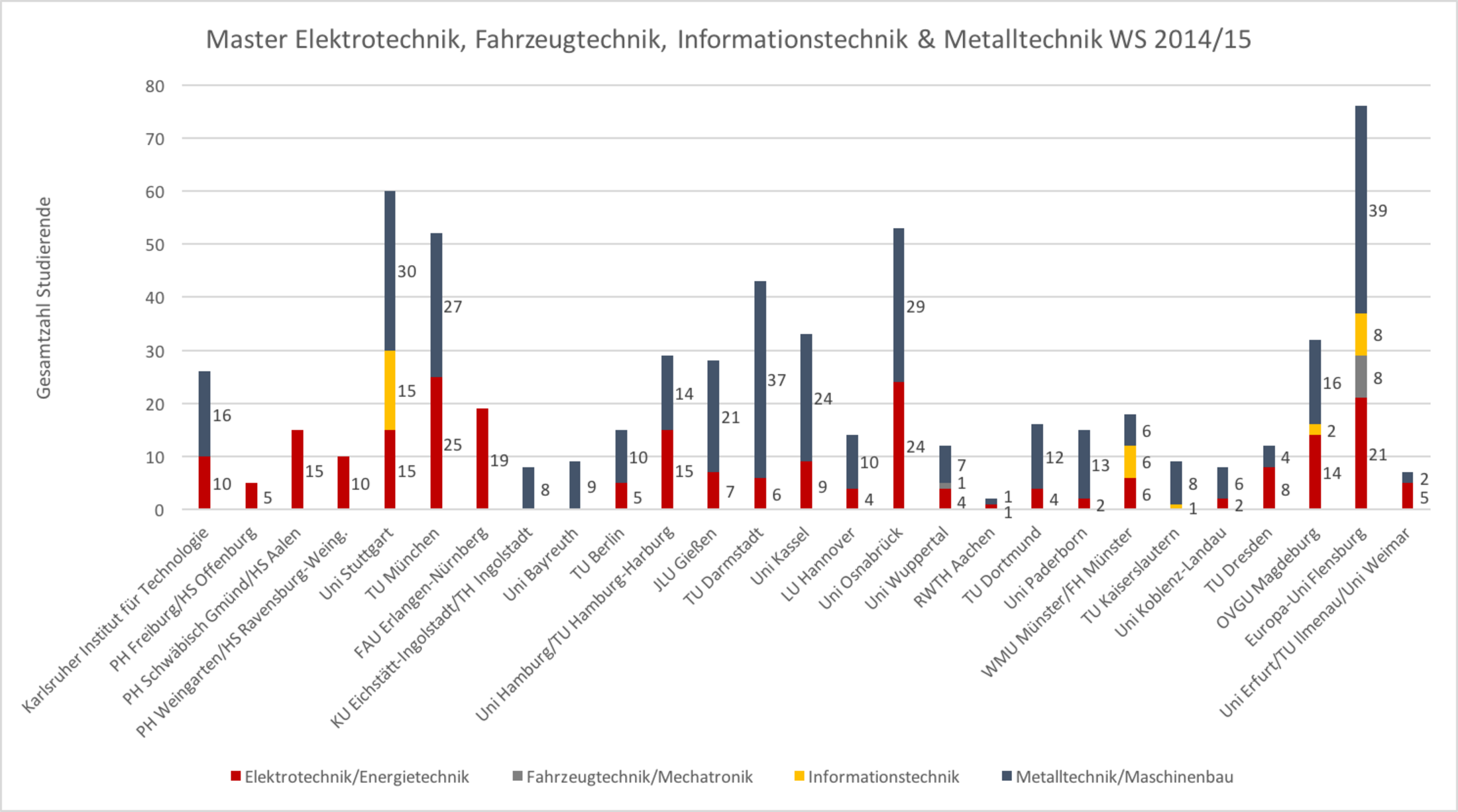 Zählt man die vier in Flensburg vertretenen beruflichen Fachrichtungen Elektrotechnik, Fahrzeugtechnik, Informationstechnik und Metalltechnik zusammen, so liegt die Europa-Universität mit 76 Studierenden zum Wintersemester 2014/15 unangefochten auf Platz 1 von allen 27 Hochschulen und Universitäten, die einen Masterstudiengang in diesem Bereich anbieten (siehe Abbildung). Bei bundesweit insgesamt 626 Studierenden waren damit 12 Prozent aller in Deutschland eingeschriebenen Studierenden bzw. etwa jeder Achte an der EUF immatrikuliert. Erst mit Abstand folgen die deutlich größeren Universitäten Stuttgart (60 Studierende), Osnabrück (53) und München (52). Auch traditionelle Standorte wie Berlin (15), Darmstadt (43), Dresden (12), Hamburg (29) oder Magdeburg (32) haben klar das Nachsehen. Die Studierendenzahlen für die Universität Bremen konnten leider mangels Zuordnung zu den gewerblich- technischen Fachrichtungen nicht ausgewertet werden.