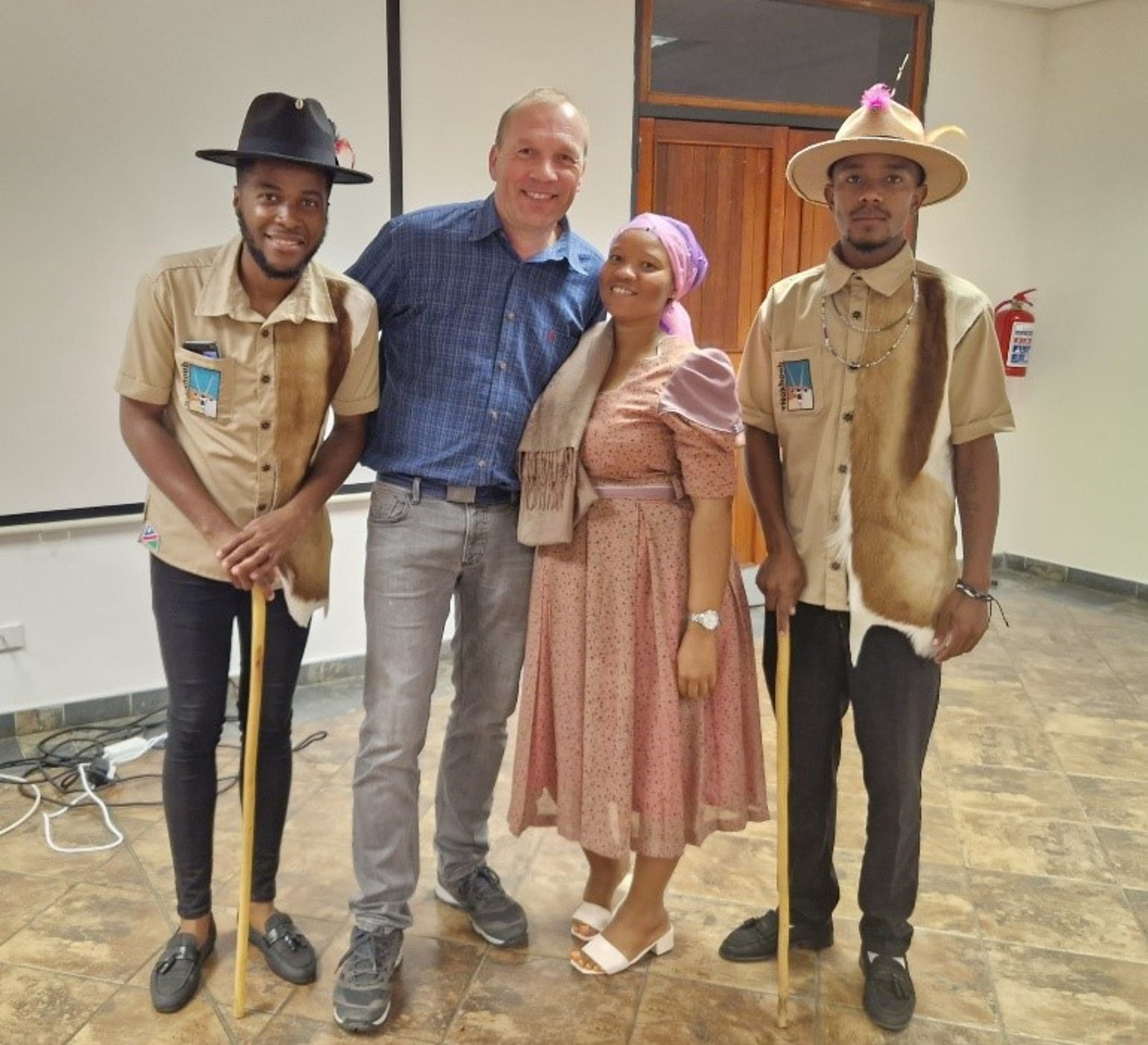 Besonders beeindruckend war der Besuch von Vertreterinnen und Vertretern der Khomanin Community, eine der indigenen Gruppen in Namibia. Die Gruppe lebt in einer Siedlung nördlich von Windhoek, ist stark mit ihrer kulturellen Identität verbunden, kämpft jedoch nach wie vor mit den Auswirkungen der Kolonialisierung und der Apartheid. Das CESAR Projekt unterstützt die Khomanin Community durch erneuerbare Energie Lösungen auf ihrer Kharoxas Farm.