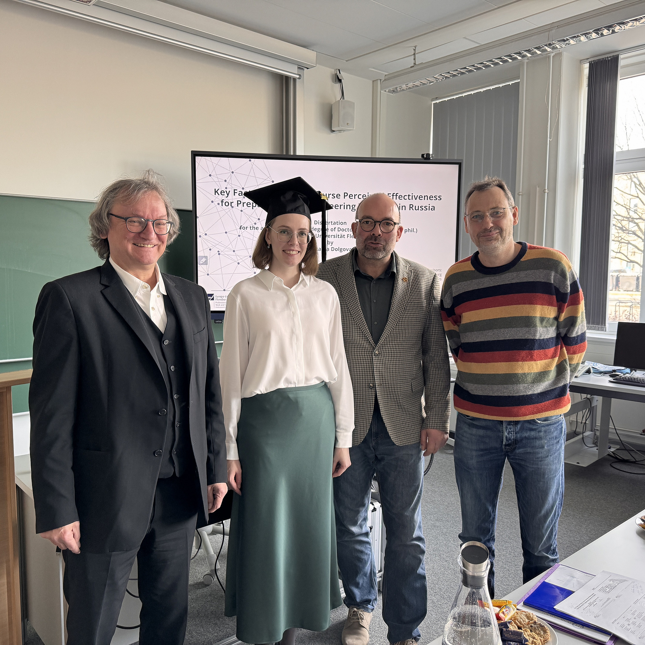 Der Titel des der Dissertationsschrift lautet: “Key Factors of Online Course Perceived Effectiveness for Preparing TVET Engineering Teachers in Russia”. Betreut wurde Nataliia Dolgova am biat von Prof. Dr. Axel Grimm. Insgesamt wurde das Promotionsverfahren an der Fakultät 1 nunmehr mit der Note „magna cum laude“ erfolgreich abgeschlossen. Den Prüfungsvorsitz hatte Prof. Dr. Peter Heering inne. Als Prüfende zur Arbeit waren der Betreuer und Gutachter Prof. Dr. Axel Grimm und als Zweitgutachter Prof. Dr. Marc Krüger von der FH Münster tätig.