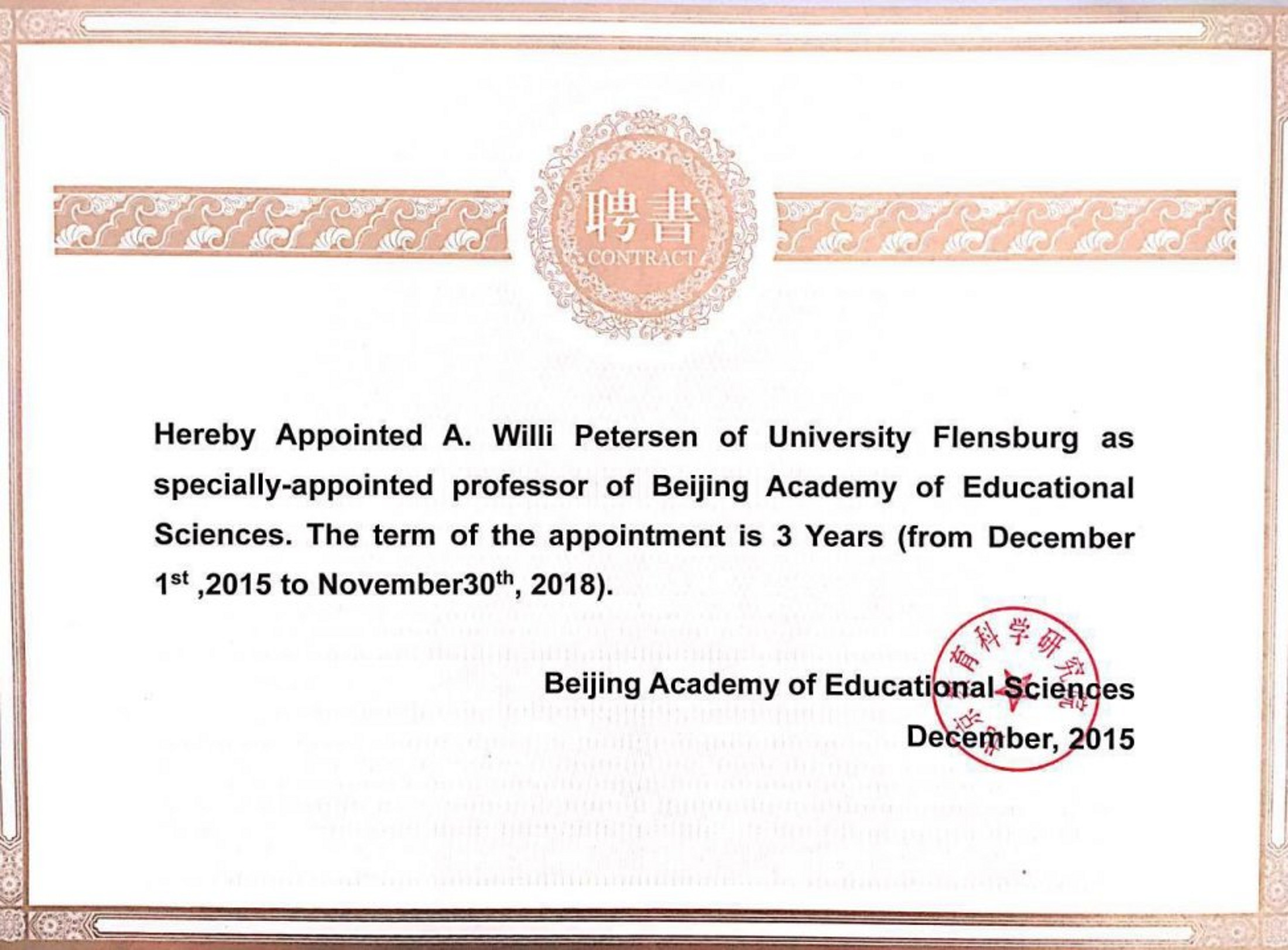 Im Rahmen der Kooperation zwischen der Europa-Universität Flensburg und der "Beijing Academy of Educational Sciences" wurde Prof. Dr. A. Willi Petersen vom biat als Anerkennung für die langjährige und gute weitere Zusammenarbeit von der Academy ehrenhalber ab Dezember 2015 für drei Jahre auch zum Professor an der "Beijing Academy of Educational Sciences" ernannt.