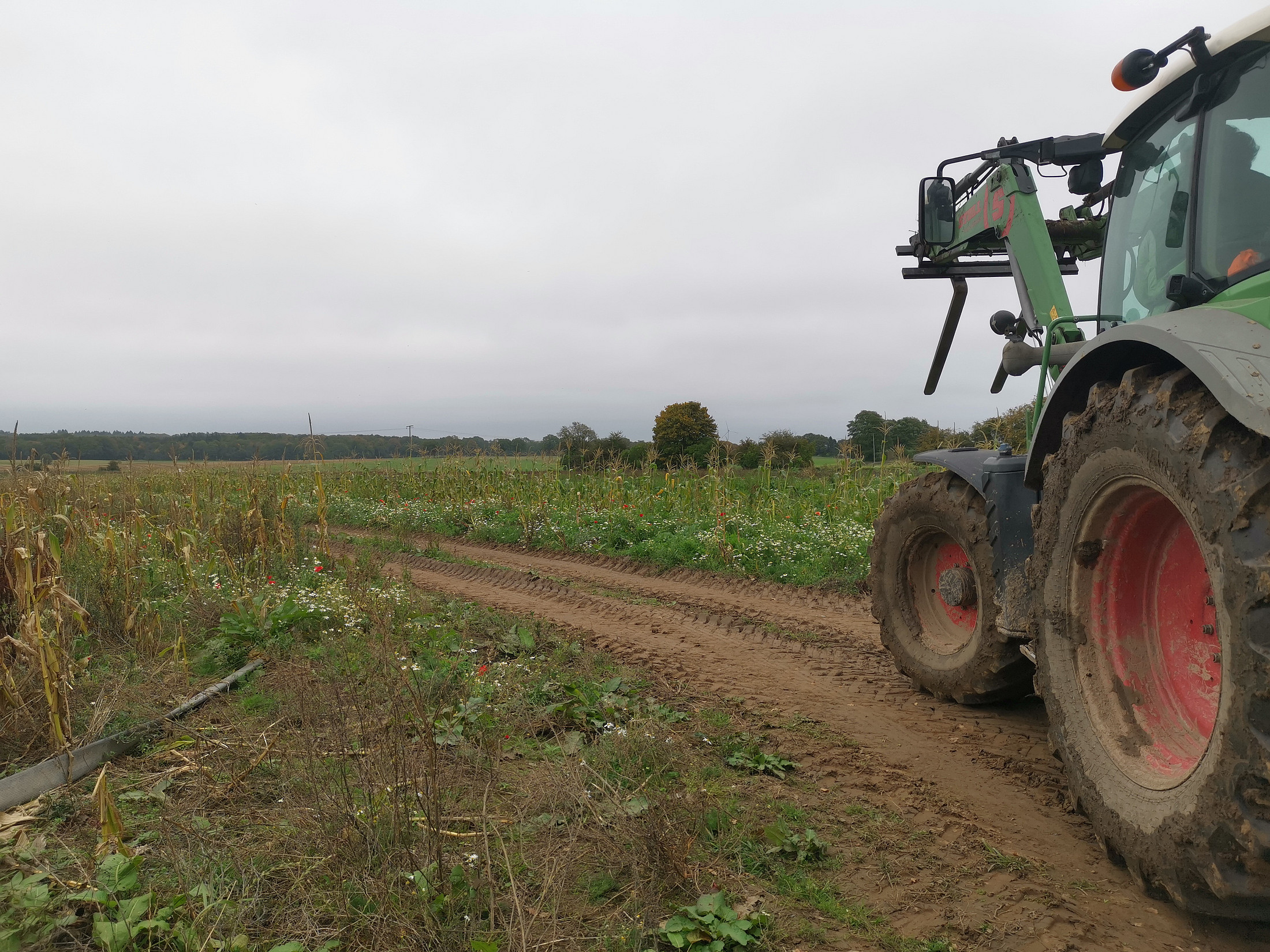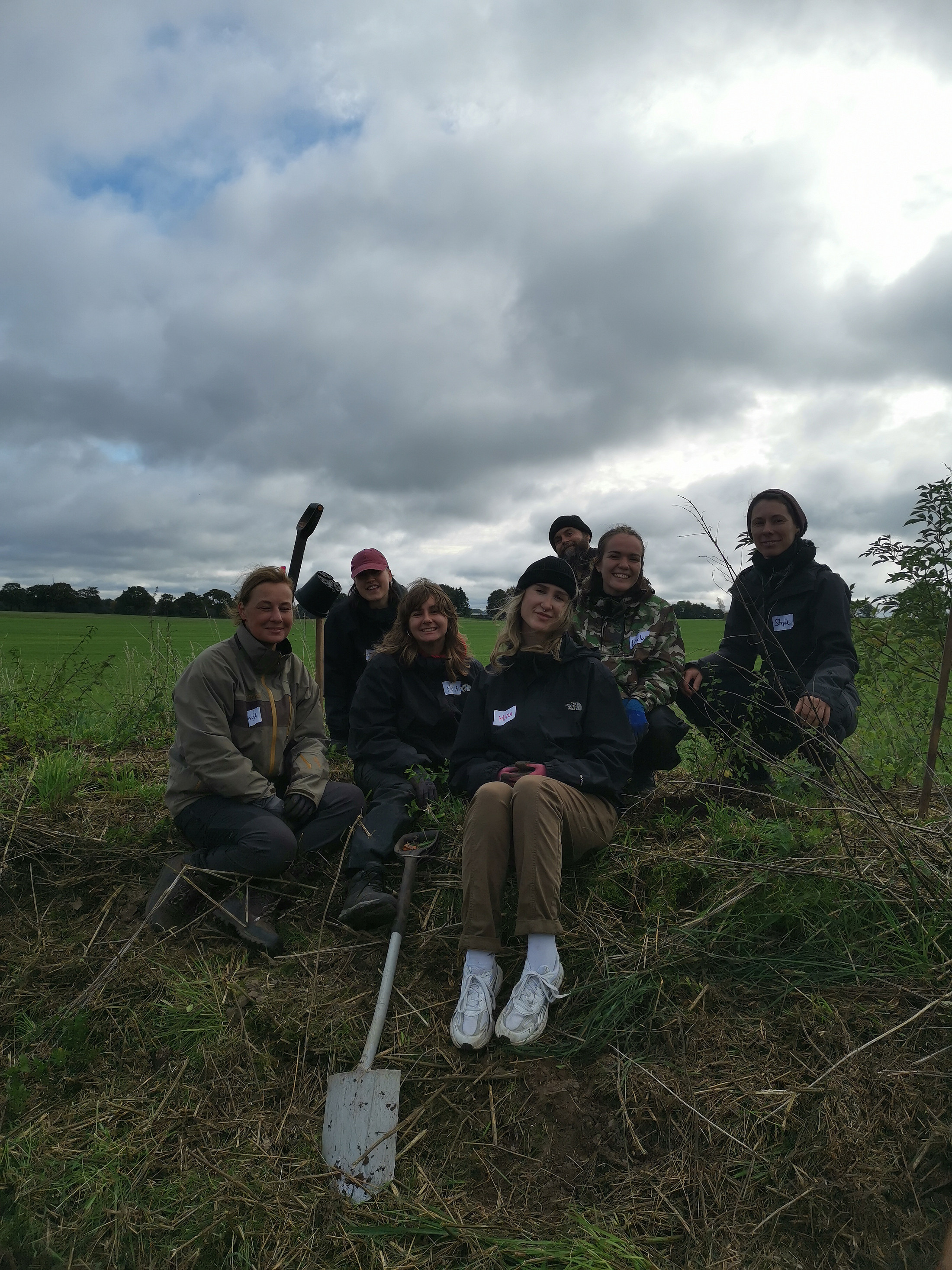 Gemeinsam mit den Studierenden reisten wir am Sonntagsmorgen mit dem EUF Bus an und wurden in Travenbrück mit warmen Getränken und Brötchen empfangen. Anschließend wurden wir zusammen mit weiteren Freiwilligen auf den Traktoranhänger geladen und zur Pflanzfläche gefahren. Wir teilten uns in Kleingruppen und erhielten von Heckenretterin Lucy Bohling eine kurze Einführung in Technik und Theorie des Knickpflanzens. Viele Arbeiten – etwa das Graben der Pflanzlöcher, das Vorbereiten und Setzen der jungen Gehölzpflanzen in den Erdwall und das Ausrichten und Befüllen mit Erde – haben wir bis zur Mittagspause selbst durchgeführt. In der Mittagspause wurden wir mit einem köstlichen Gemüsecurry aus frischen Ernteprodukten des Solawi-Gemüsefeldes neben dem Knick versorgt. Anschließend fanden noch das Kontrollieren, Bewässern und Mulchen der neuen Knick-Gehölze statt. Es blieb auch Raum und Zeit für Austausch und Reflexion: Zwischen Pflanzreihen diskutierten wir über die Rolle von Biotopen in Agrarlandschaften, die Herausforderungen der Akzeptanz durch landwirtschaftliche Akteur*innen und entdeckten erfahrene Personen bezüglich Pyrolyse-Öfen und dem Bauen von Wildschutzzäunen in unseren Reihen. Am Ende versammelten sich alle Teilnehmenden zu einem gemeinsamen Ausklang mit Holunder-Punsch, was die Gemeinschaftserfahrung abrundete.