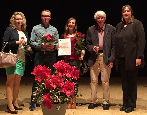 Die Absolventen Svenja Pansegrau und Mirco Wachholz wurden für ihre Bachelorarbeiten mit dem Preis der Europa-Universität Flensburg in Anerkennung der vorbildlichen Umsetzung des Leitbildes der Universität ausgezeichnet. Bei der feierlichen Übergabe am 30. Oktober 2015 im Deutschen Haus würdigte der Präsident der EUF Prof. Dr. Werner Reinhart die herausragende Qualität der Abschlussarbeiten. Beide Arbeiten beschäftigen sich mit dem Forschungsgebiet der organischen Redox-Flow-Batteries. Dieser Ansatz ist ein innovatives Konzept zur Energiespeicherung von erneuerbaren Energien, da Stromerzeugung und -verbrauch dieser nicht gleichzeitig erfolgen. Daher ist eine Speicherung dieser überschüssigen Energie erforderlich. Frau Pansegrau hat in diesem Zusammenhang eine sogenannte Redox-Flow-Battery mit einem Anthrahydrochinon-Benzochinon-System nach Narayanan weiterentwickelt während Herr Wachholz den Farbstoff Alizarin als geeignetes Reduktionsmittel für solche Batteriesysteme erforschte.