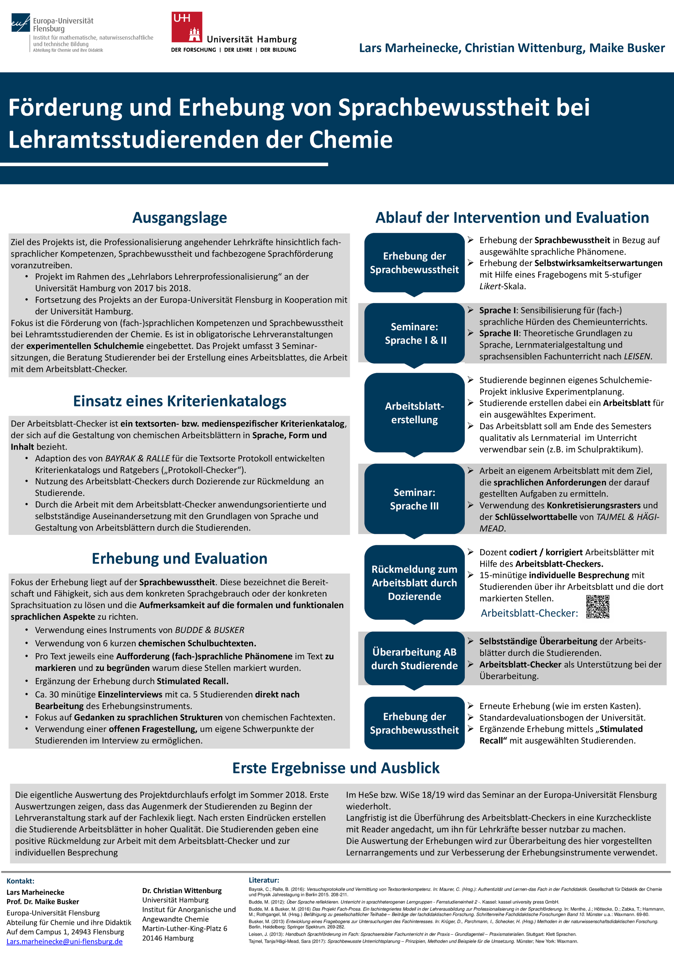In diesem Jahr wurde die Jahrestagung der Fachgruppe Chemieunterricht vom 13. bis zum 15.09.18 an der PH Karlsruhe ausgerichtet. Die Abteilung für Chemie und ihre Didaktik war mit vier Postern und drei Vorträgen vertreten. Dr. Dominique Rosenberg präsentierte in einem Experimentalvortrag zum Thema "Spannende Versuche zu Redox-Flow-Batterien mit Chinonen, Rinden und Huminsäuren" weiterführende Arbeiten zu ihrer Dissertation. Im Vortrag von Prof. Dr. Maike Busker (Europa-Universität Flensburg) und Prof. Dr. Monika Angela Budde wurden neue Erkenntnisse zur Erhebung von Sprachbewusstheit von Lehramtsstudierenden im Fach Chemie aus dem Projekt Fach-ProSa (Fachbezogene Professionalisierung zur Sprachförderung) vorgestellt. Im Vortrag von Dominik Heidenreich, Dr. Hanne Rautenstrauch und Prof. Dr. Maike Busker wurden Ergebnisse einer Untersuchung zum Interesse und Selbstwirksamkeitserwartungen von Schülerinnen und Schülern im Vergleich von Chemie- und NaWi-Unterricht präsentiert.
