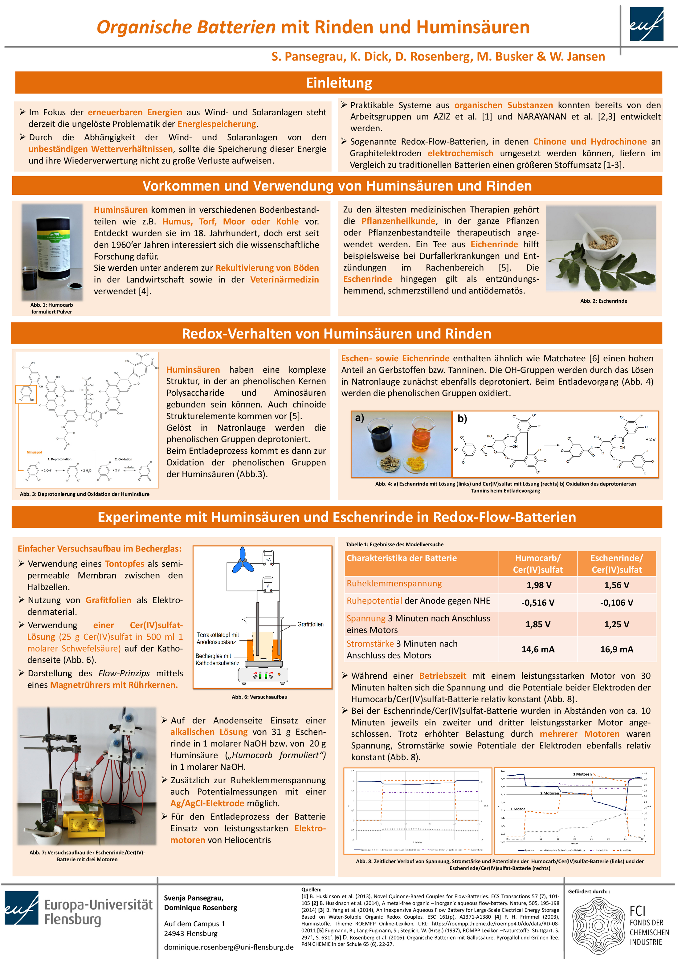 Im Vortrag wurden Möglichkeiten, Redox-Flow-Batterien im Chemieunterricht experimentell zu erschließen, vorgestellt. Dabei standen neben Modellversuchen, mit denen das Prinzip von Flow-Zellen für Schülerinnen und Schüler veranschaulicht werden kann, verschiedene interessante organische Substanzen im Fokus, die in Alltagsprodukten (z.B. Rotwein, Kaffee und grüner Tee) enthalten sind und mit denen organische Batterien betrieben werden können.