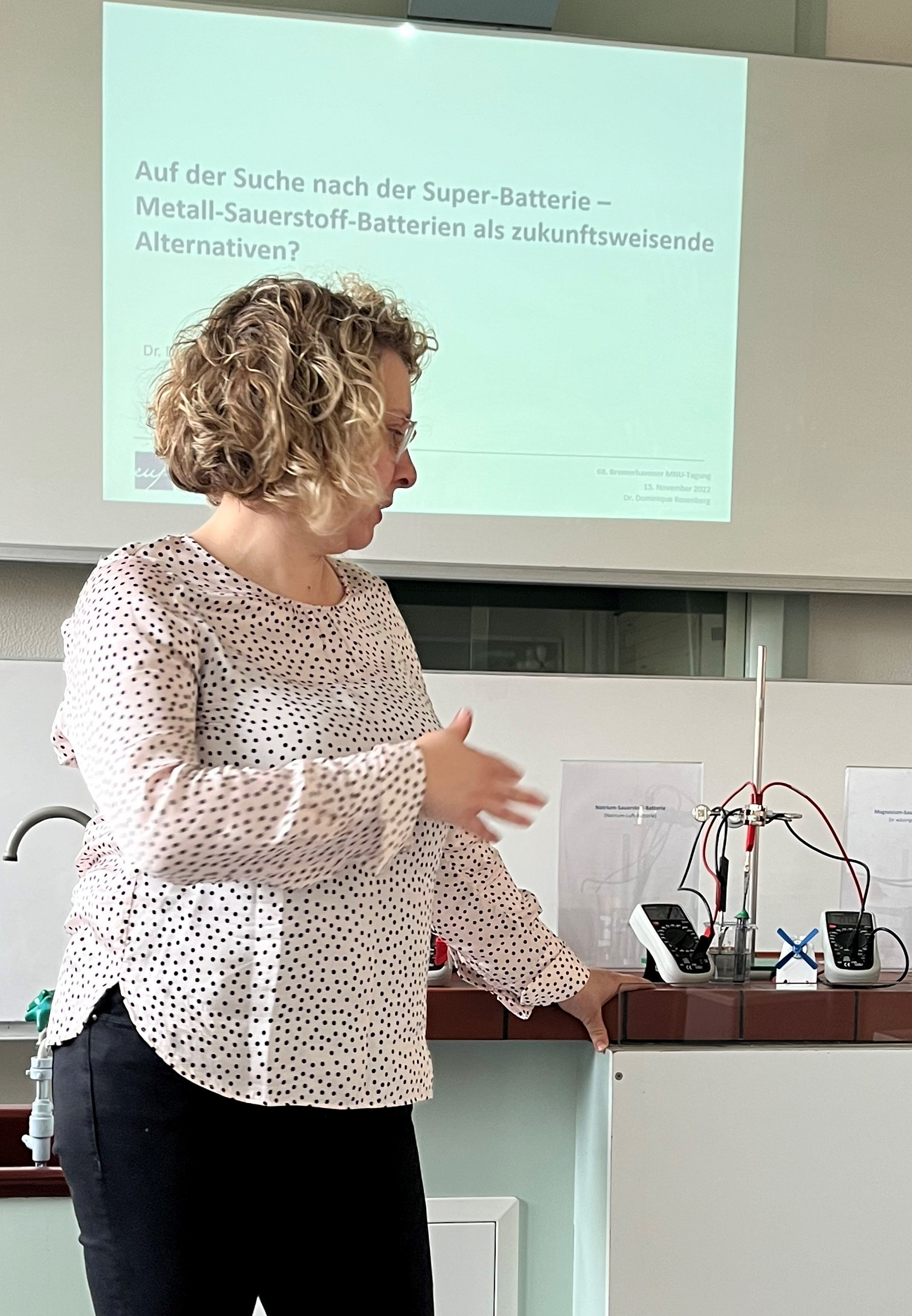 An zwei Tagen konnten Lehrkräfte, Referendare, Studierende und Interessierte das vielseitige Programm um die MINT-Fächer besuchen und genießen. Auch Dr. Dominique Rosenberg war wie in den Jahren davor mit einem eindrucksvollen Experimentalvortrag zu den innovativen Themen der Metall-Luft- und Lithium-Ionen-Batterien mit Kunststoffen vertreten, für die es staunende Anerkennung von den Besucher:innen des Vortrages gab. Neben einer Einführung in die aktuelle Erforschung von Metall-Luft-Batterien und deren Schwerpunkt wurden ebenfalls leicht durchführbare, praktische Versuche gezeigt.