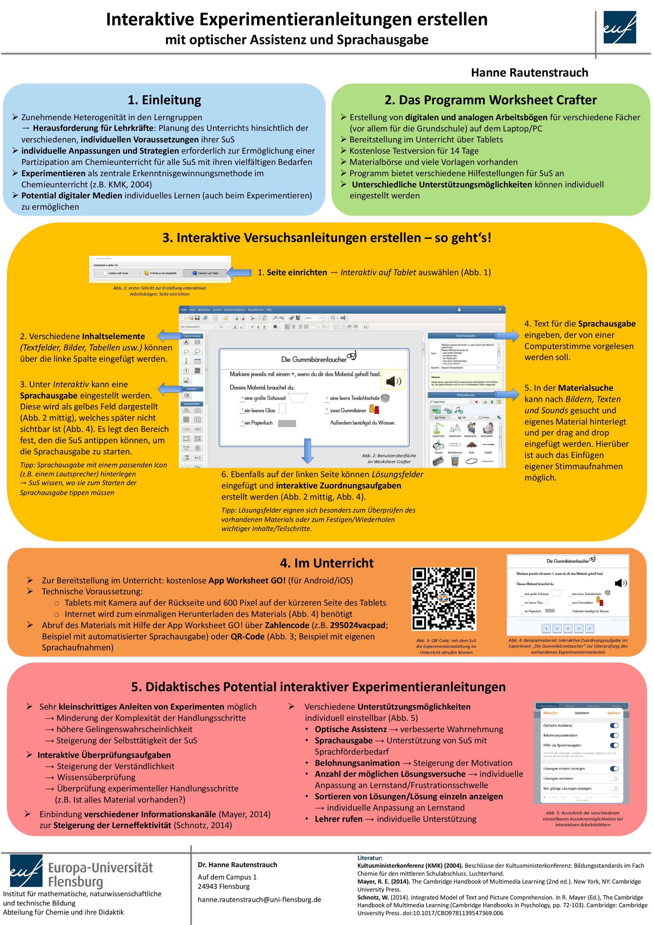 Am 12. und 13. Juni 2021 fand die Online-Tagung "Digitale NAWIgation von Inklusion" der Friedrich-Schiller-Universität Jena statt. Die Abteilung Chemie und ihre Didaktik war auf der Tagung durch einen Posterbeitrag von Dr. Hanne Rautenstrauch vertreten. Auf dem Poster wurde präsentiert, wie digitale, interaktive Versuchsanleitungen erstellt werden können und welches Potential diese besitzen, um Schülerinnen und Schülern eine aktive Partizipation am Unterricht durch eigenständiges Experimentieren zu ermöglichen. Beispielsweise bieten interaktive Versuchsanleitungen die Möglichkeit, Handlungsvorgänge sehr kleinschrittig anzuleiten und so komplexe Aufgaben zu vereinfachen. Des Weiteren sind Unterstützungsmöglichkeiten, wie eine optische Assistenz oder eine Sprachausgabe, einstellbar und können je nach Bedarf der Schülerinnen und Schüler angepasst werden.