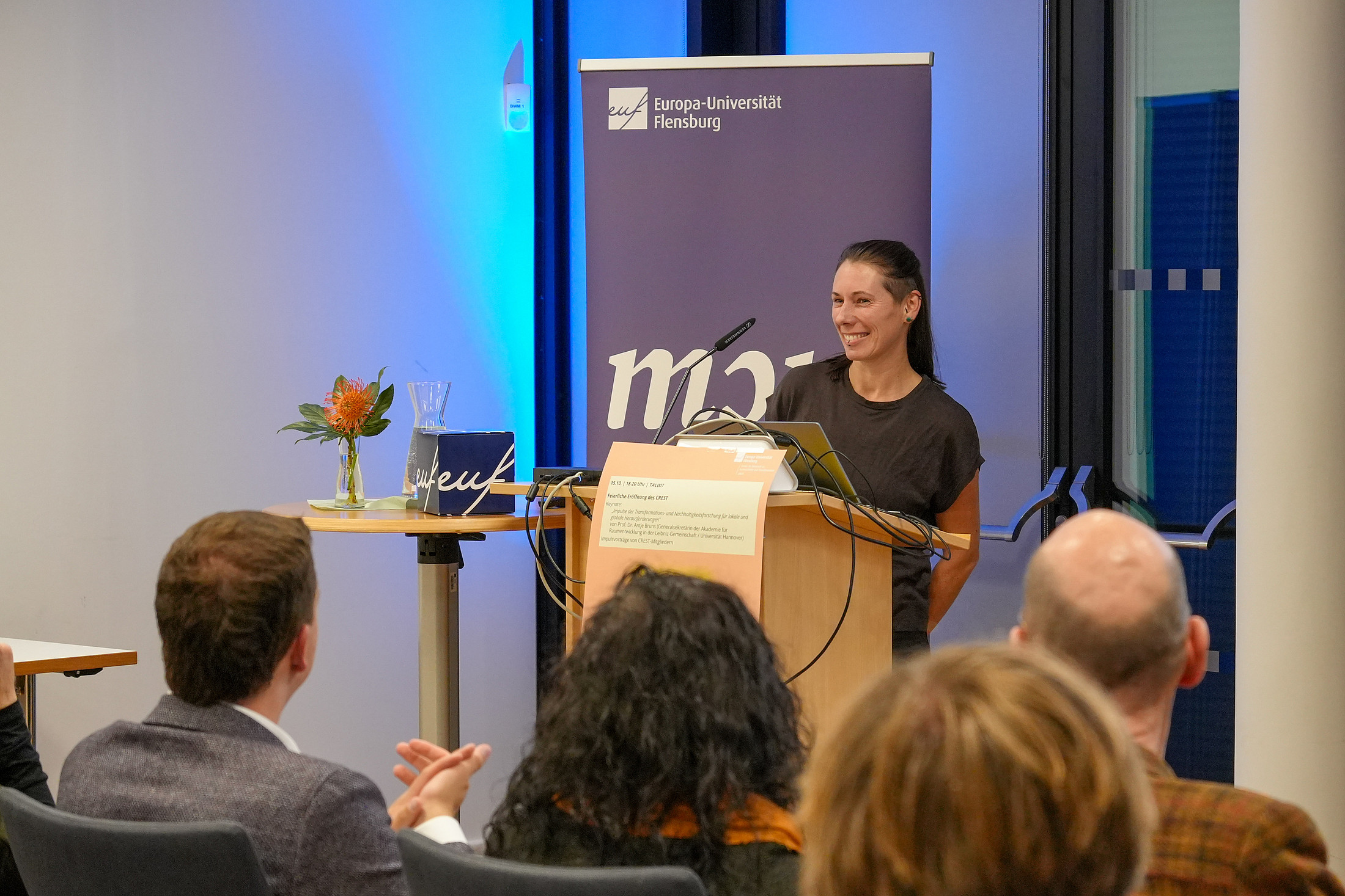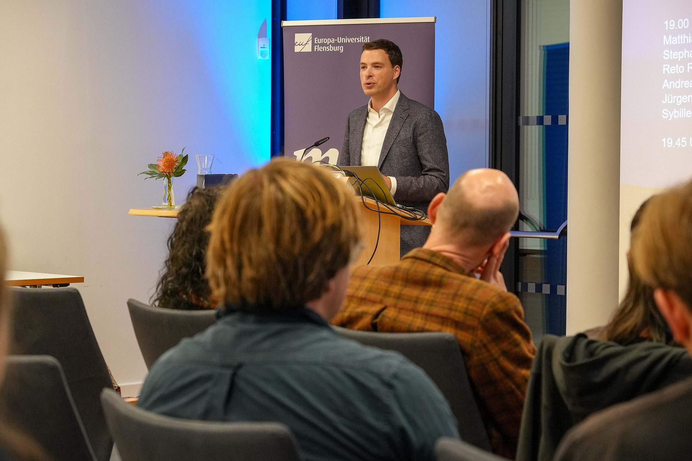 Kolleg*innen aus verschiedenen Disziplinen – von der Rechtswissenschaft über die Literaturwissenschaft und dänische Literatur bis zur Geografie – zeigten im Miniaturformat, wo Themen von Transformation oder Nachhaltigkeit in Ihrer Forschung eine Rolle spielen.