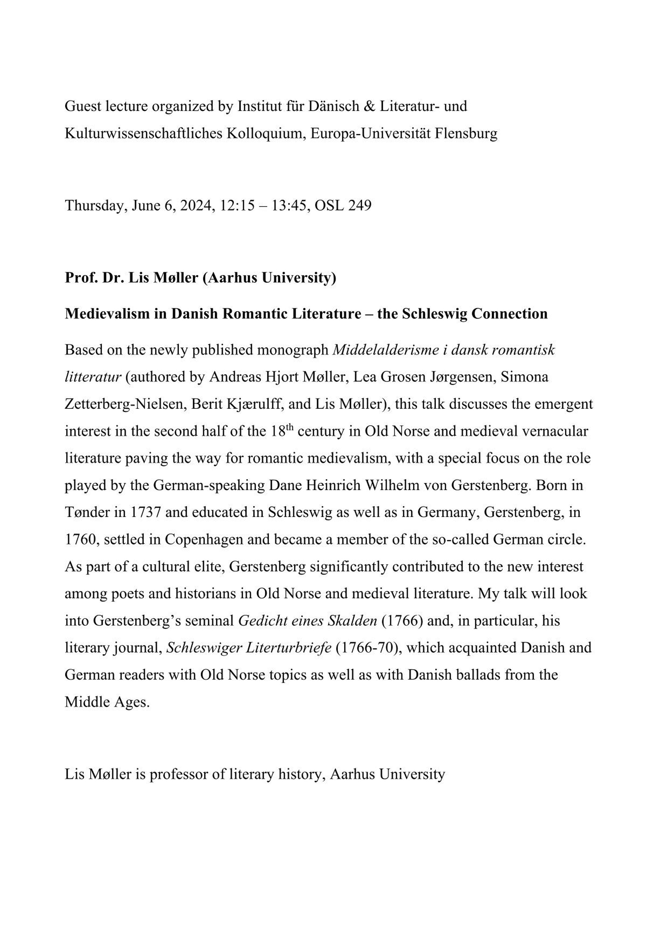 Gæsteforelæsning: Prof. Dr. Lis Møller (Aarhus Universitet): Medievalism in Danish Romantic Literature - The Schleswig Connection