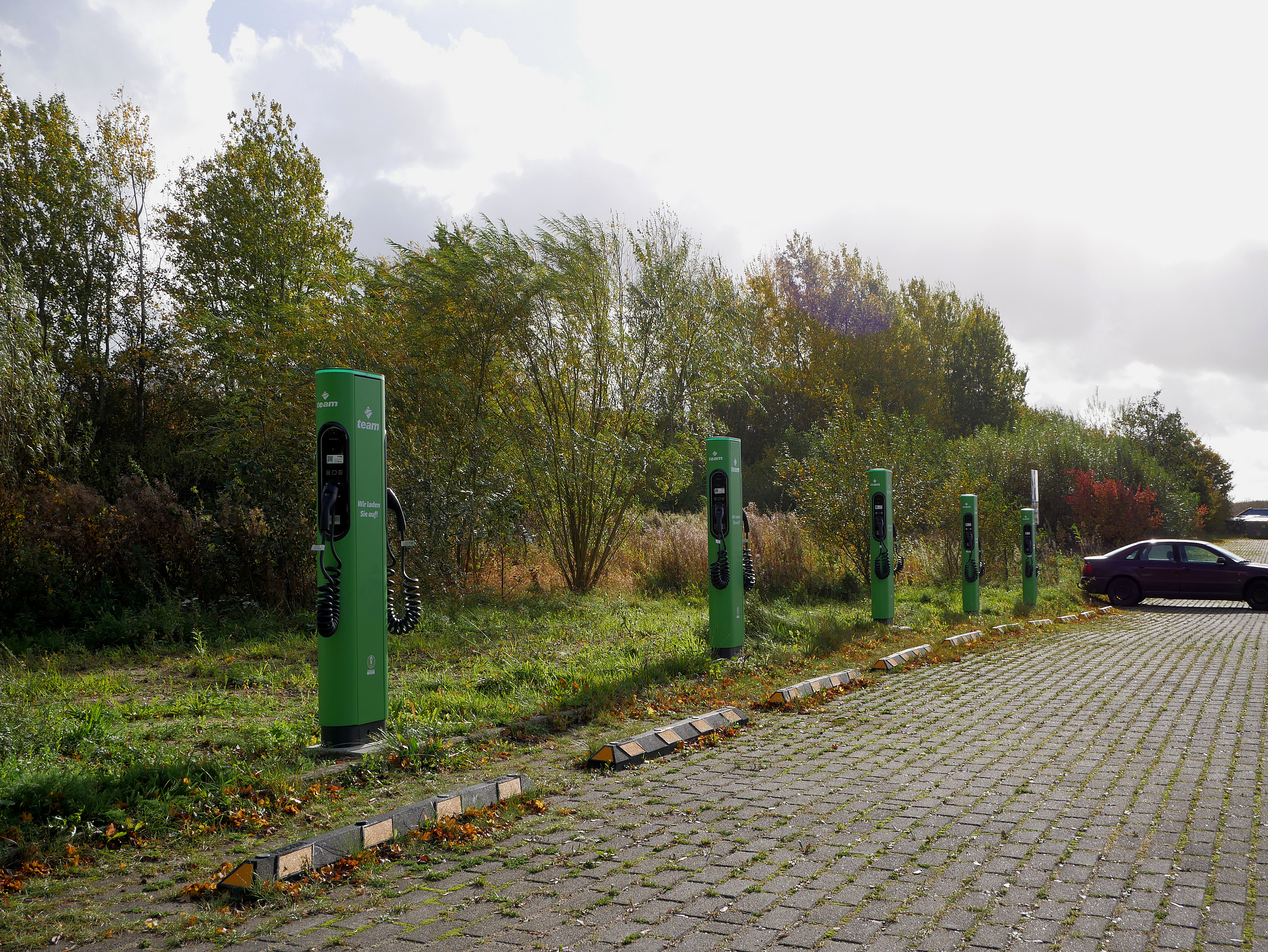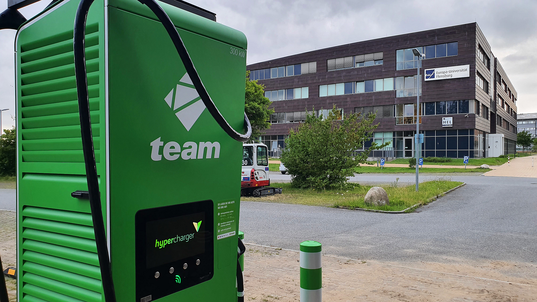 E-Auto Ladesäulen von Team, die auf dem Campus verteilt aufgebaut sind.