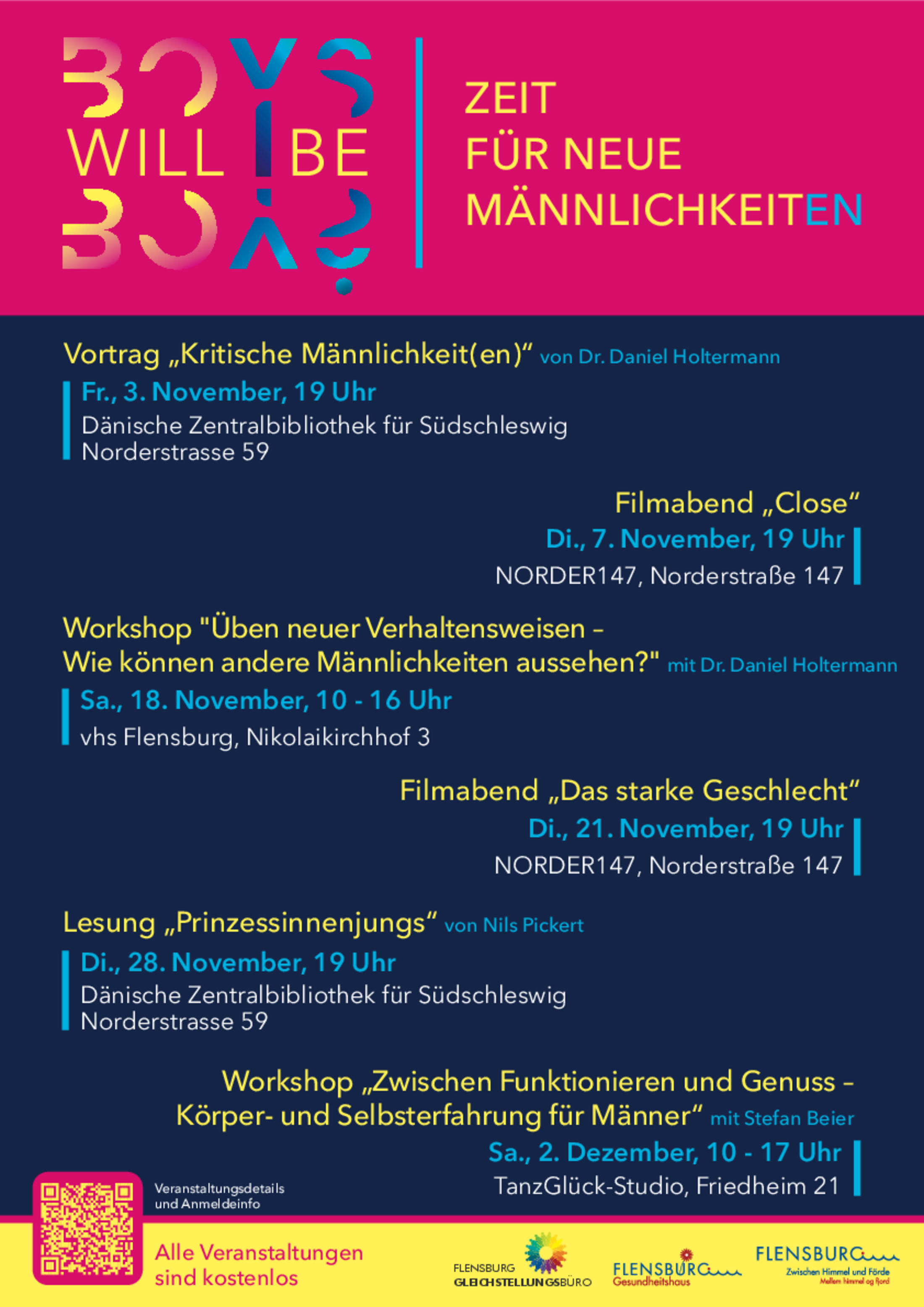 Das Gleichstellungsbüro der Stadt Flensburg organisiert im Zeitraum vom 3. November bis 2. Dezember die Veranstaltungsreihe "Boys will be boys? Zeit für neue Männlichkeit(en)".
