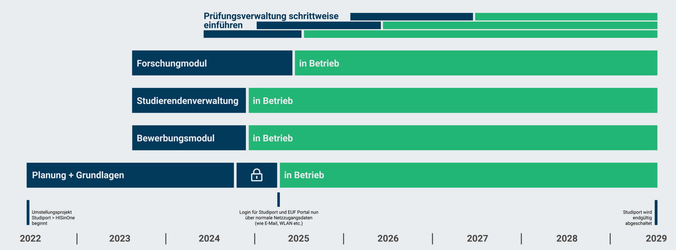 For the "Teaching and Examination" area, this will lead to a gradual shift away from Studiport and into the EUF Portal by 2029.