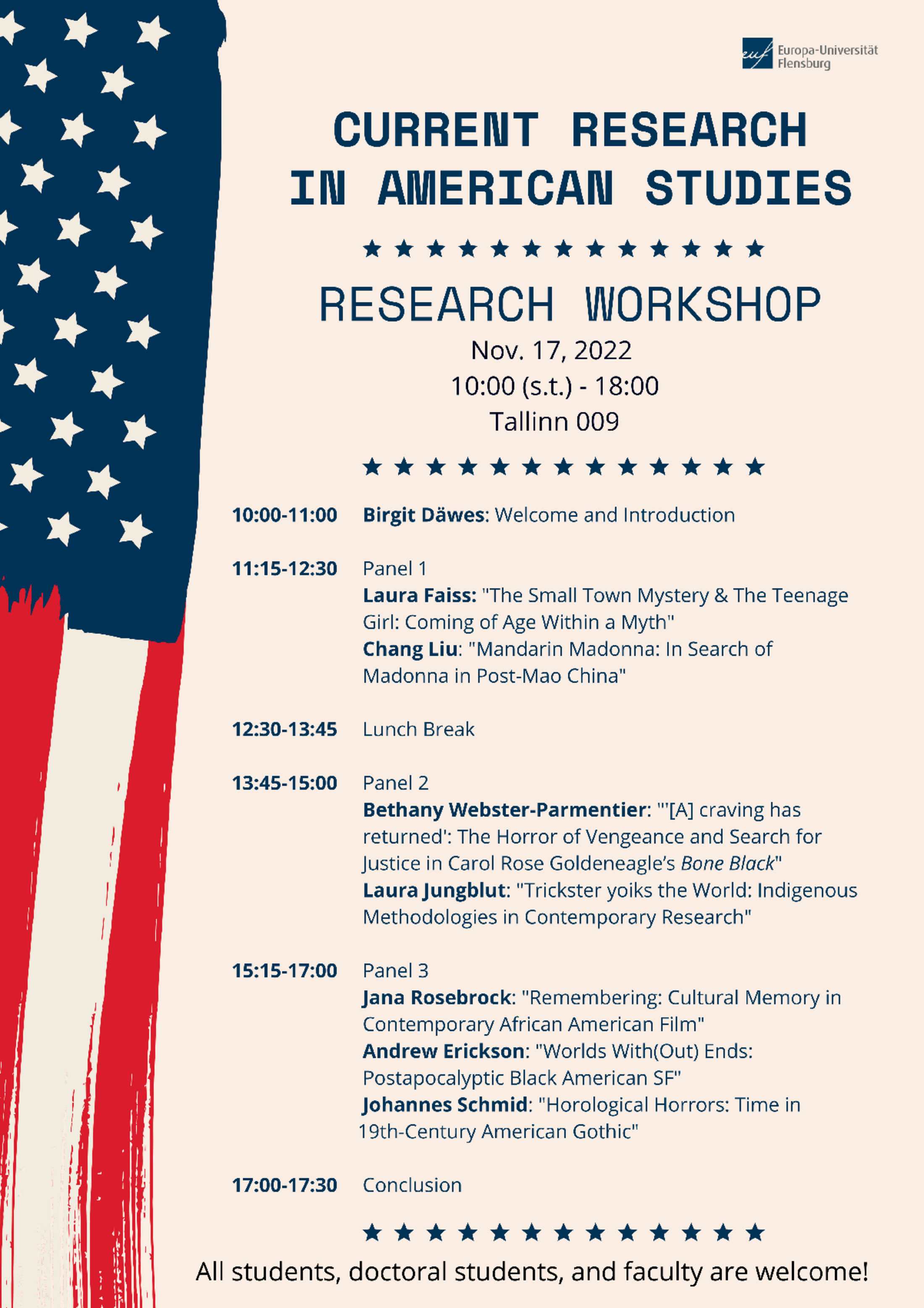 Das Programm findet sich unter https://www.uni-flensburg.de/englisch/forschung-projekte/forschungsworkshop-current-research-in-american-studies-2022.