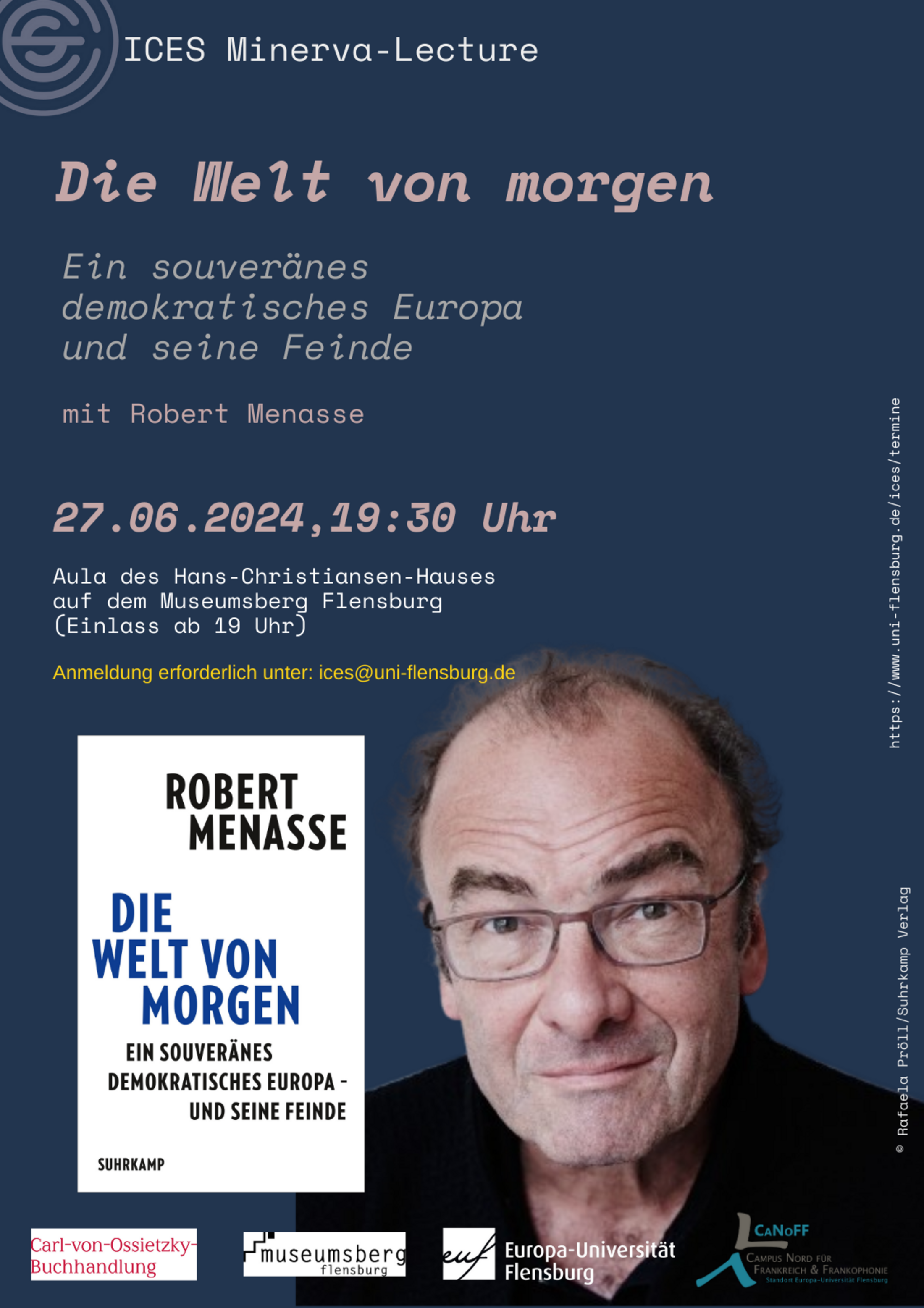 Wir freuen uns sehr die erste Minerva-Lecture ankündigen zu dürfen, die das ICES in diesem Jahr in Kooperation mit dem Zentrum für Frankreich und Frankophonie (CaNoFF) organisiert. Der österreichische Literat und Essayist Robert Menasse wird mit Margot Brink (und evtl. weiteren Podien-Teilnehmer:innen) über sein neues Buch "Die Welt von morgen - Ein souveränes demokratisches Europa – und seine Feinde" (Suhrkamp 2024) sowie seine Europaromane "Die Hauptstadt" (2017) und "Die Erweiterung" (2022) sprechen.