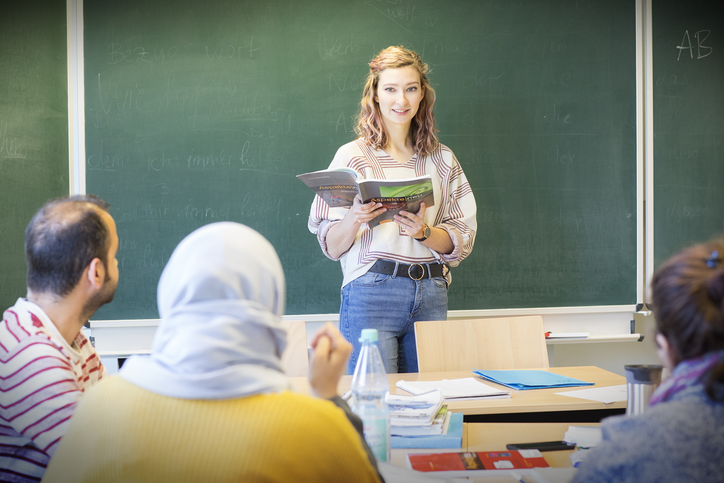 Eine Stundierende hält ein Referat vor Kommilitoninnen und Kommilitonen.