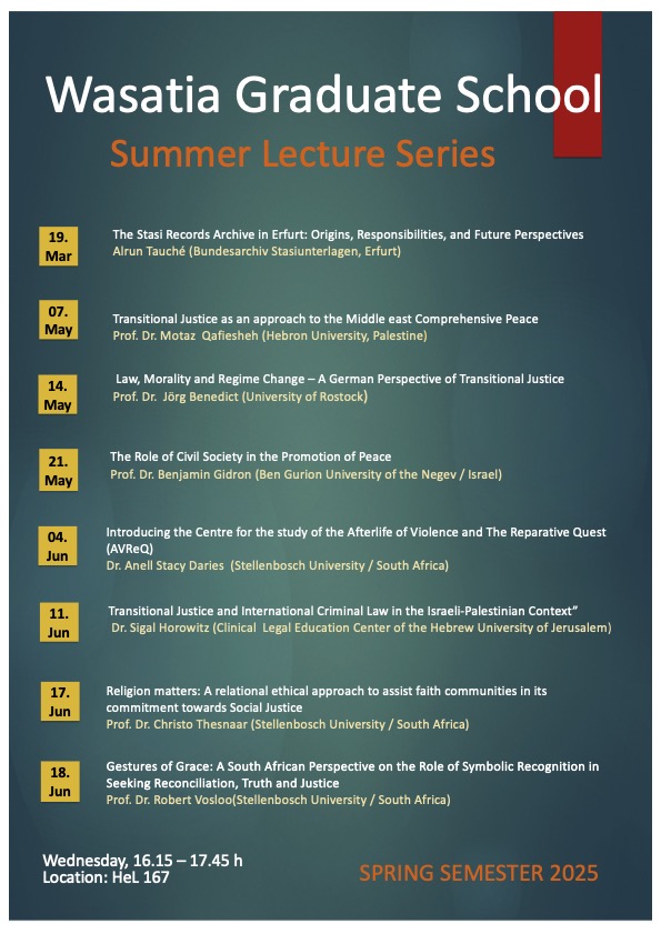 Poster_Wasatia Lecture series Wednesday, 16.15 – 17.45 h Location: HeL 167 19. Mar Wasatia Graduate School Summer Lecture Series SPRING SEMESTER 2025 The Stasi Records Archive in Erfurt: Origins, Resp