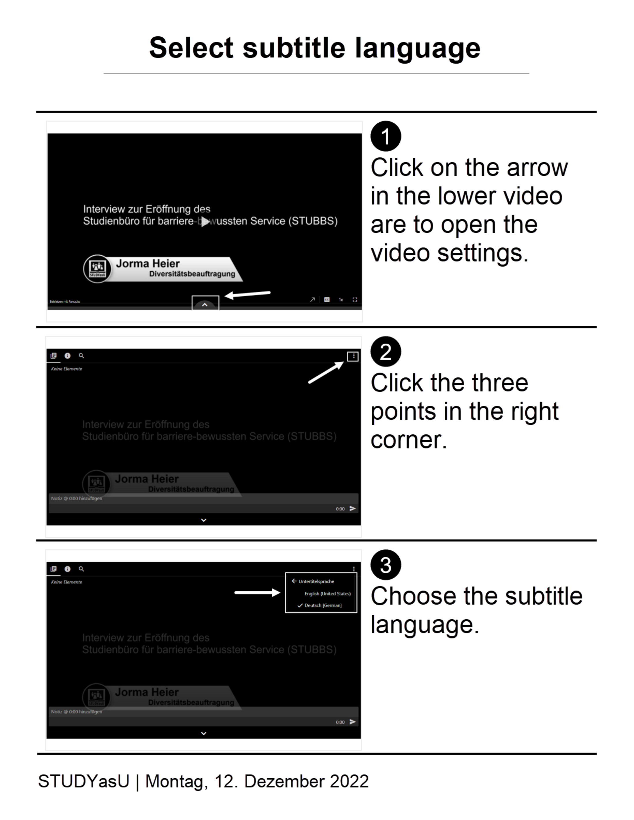 - Subtitles: The videos have German and English subtitles. You can switch between both subtitles via the video settings.