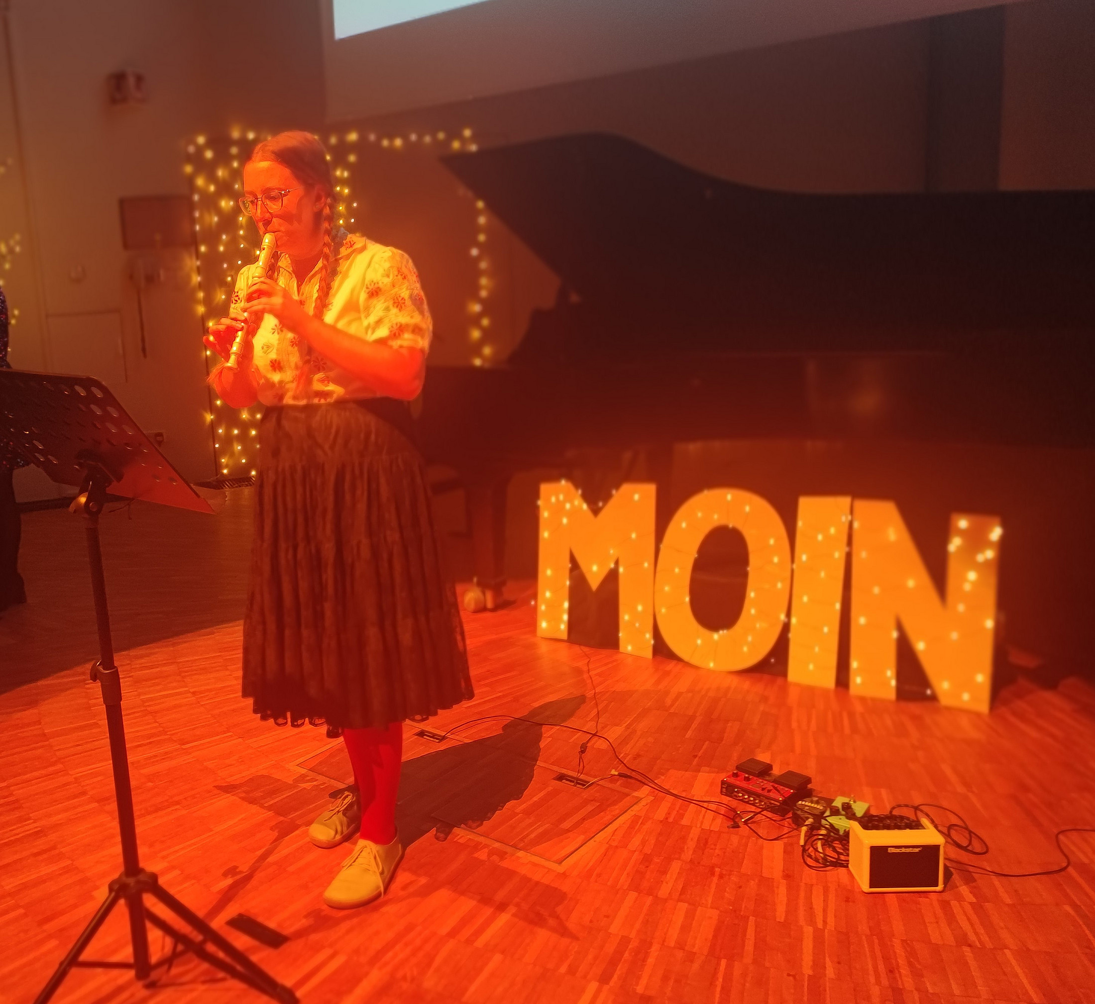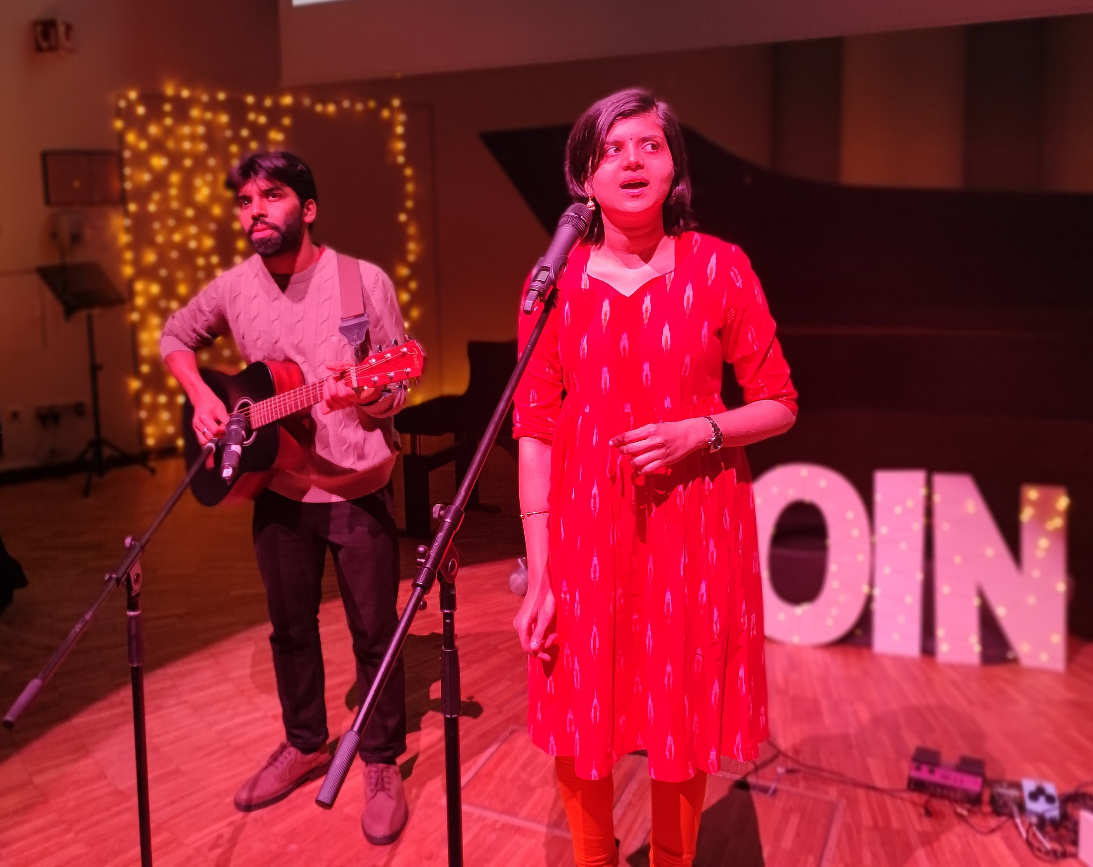 14 programme elements were organised by the international students. Muhammad Taha Siddiqui from Pakistan, a student at Flensburg University of Applied Sciences, started the programme with two songs on acoustic guitar: "Tum or Main" in Urdu and "I can't go". He accompanied Sanika Abhyankar, an Indian Master's student in the programme "Culture - Language - Media", who sang the Hindi song "Laagi laagi re lagan chitchor".