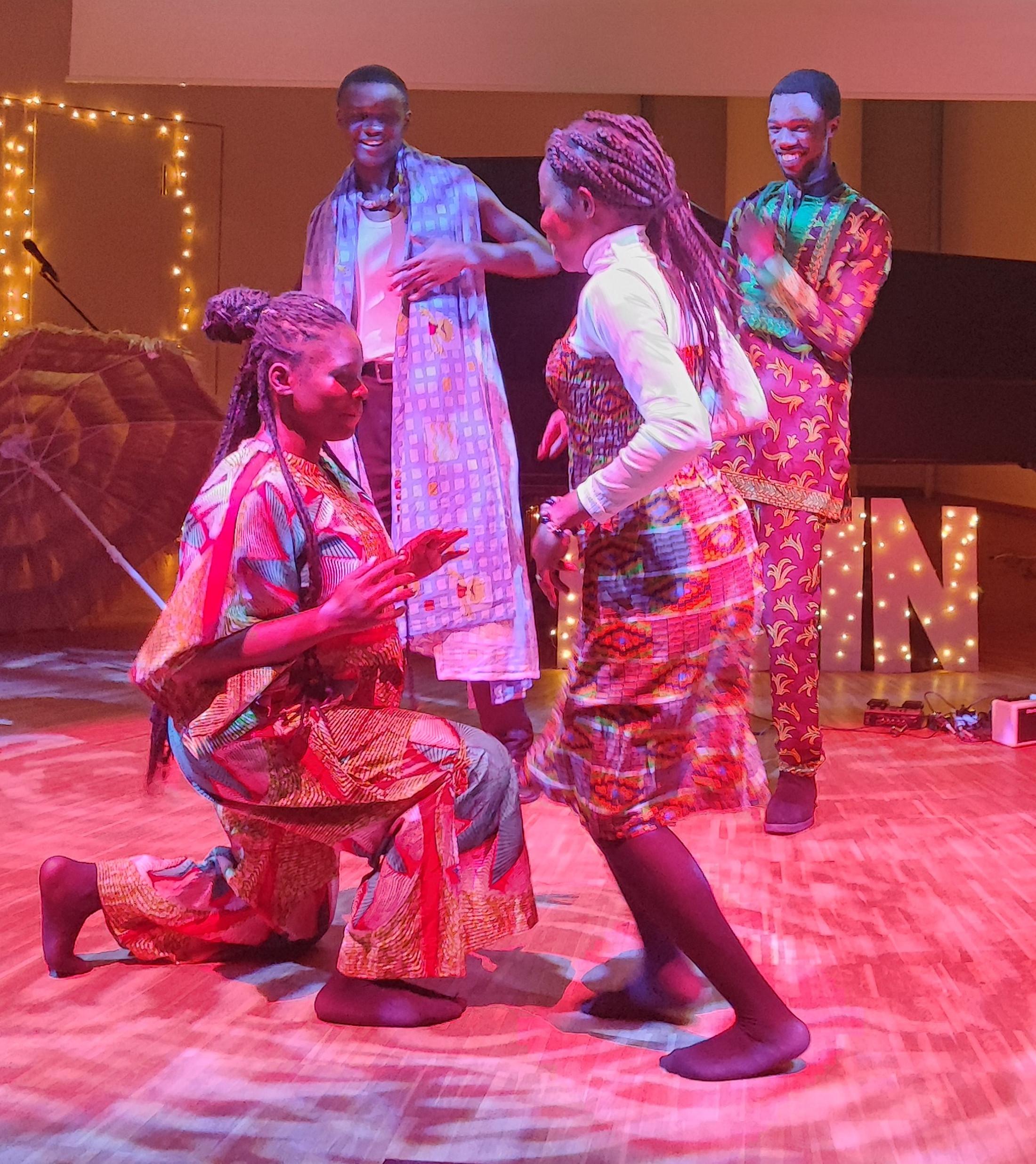 "The man I love" by George Gershwin and "Black keys Etude" by Frédéric Chopin were then played by the Italian exchange student Giorgio Gioia, who studies "Culture - Language - Media" at the EUF. The four Ghanaian exchange students Grace Amenuveve Amavi, Emmnauel Adu , Obed Baidoo and Archill Ziga were enthusiastically welcomed with classical dances from their home country and a drum solo.