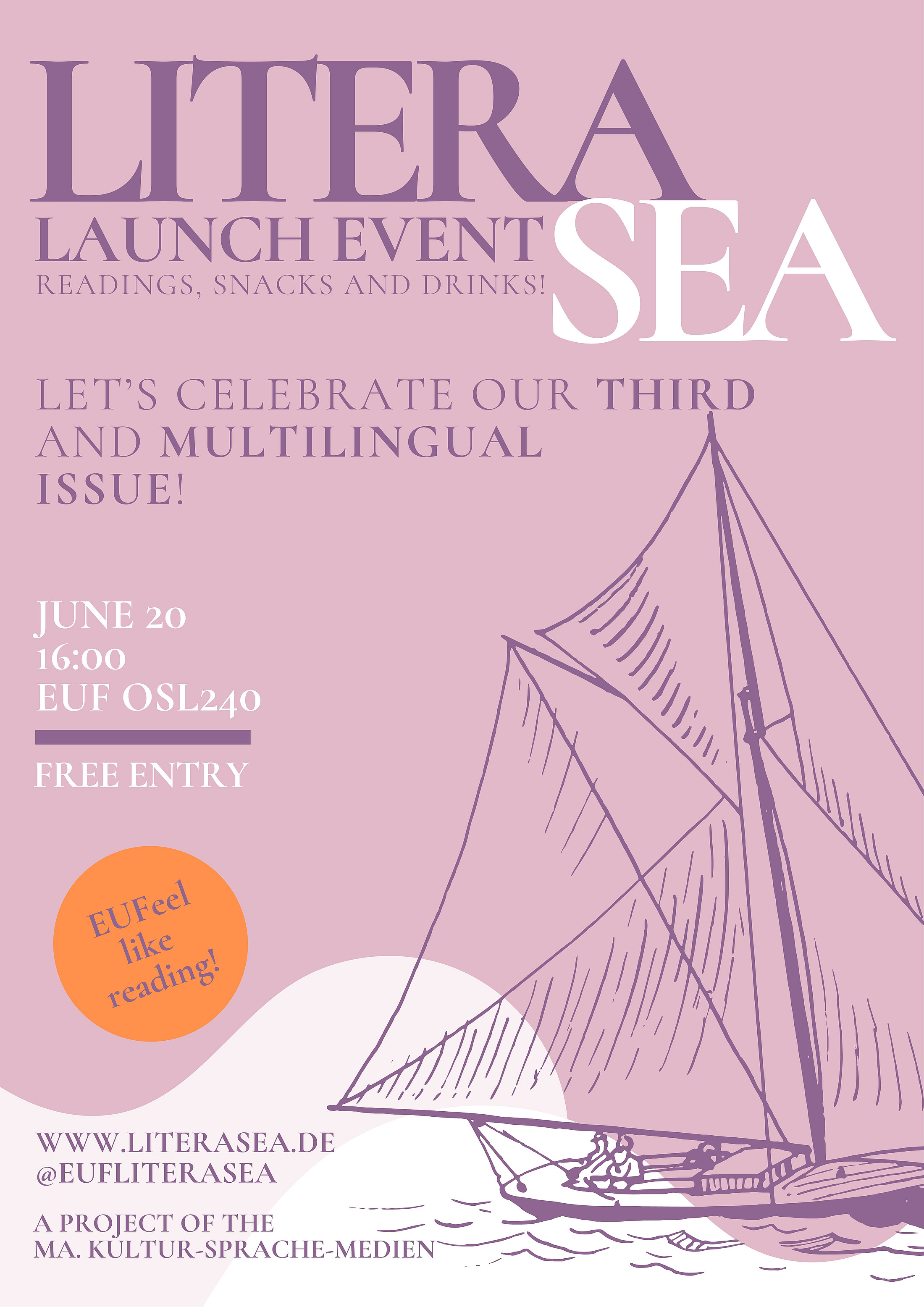 Beim Launch Event werdet ihr außerdem die neue Ausgabe der Litreasea (bar) kaufen können, denkt also jetzt daran noch rechtzeitig vorzubestellen, meldet euch dazu gerne über das Kontaktformular unsere Website oder direkt bei eufliteraryjournal@uni-flensburg.de.
