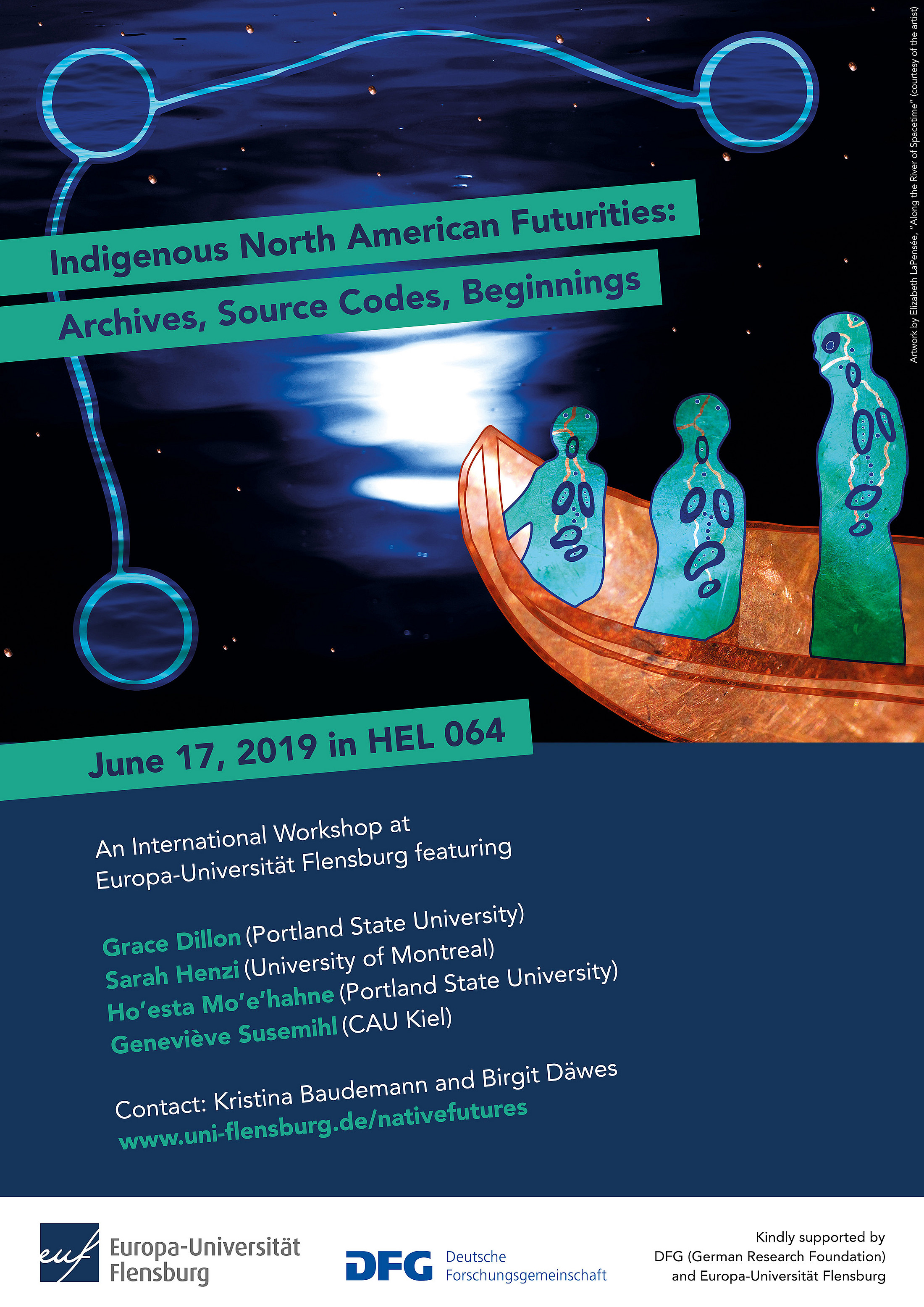 In June 2019, the Flensburg-based research project "Knowing Tomorrow: Twenty-First Century Native North American Archives of Futurity" (organized by Prof. Dr. Birgit Däwes and assistant researcher Kristina Baudemann, and funded by the German Research Foundation DFG) will be launched with an opening event that brings together Native and non-Native scholars to discuss Indigenous temporality, futurity, epistemology, and representation. We cordially invite you to join us for our international workshop "Indigenous North American Futurities: Archives, Source Codes, Beginnings" at the Europa-Universität Flensburg. We welcome students, teachers, members of the EUF and of other universities and cordially extend our invitation to anyone interested in the Indigenous future. There will be no fee; please register by June 7, via native.futures@uni-flensburg.de.