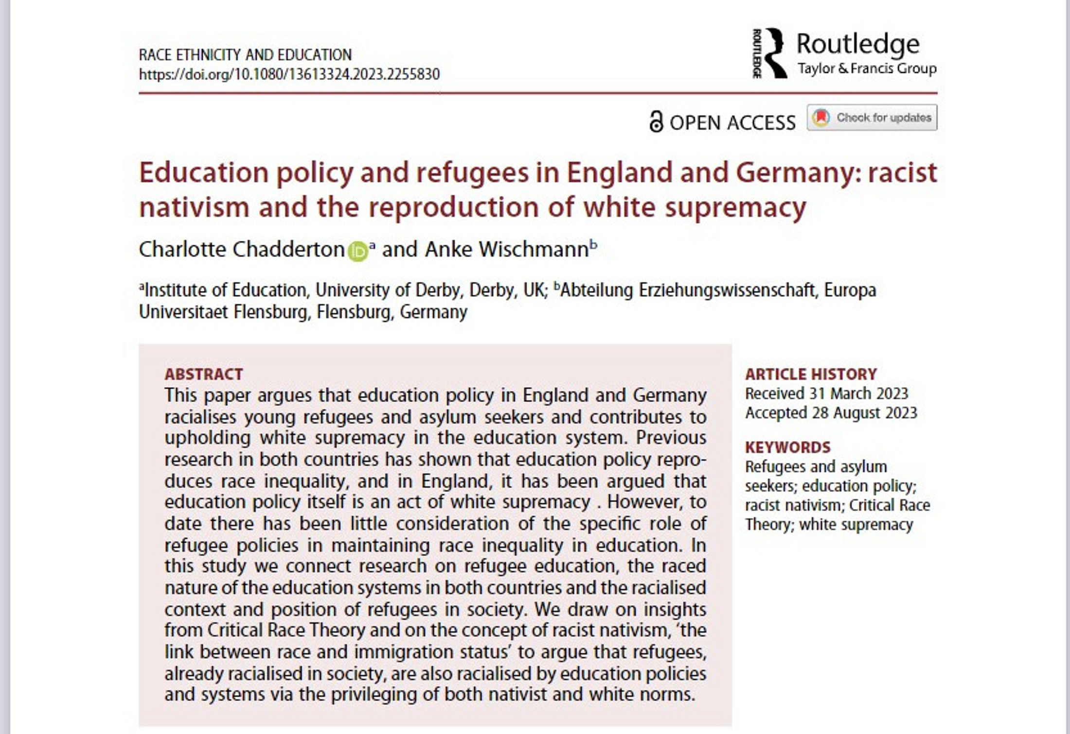 This paper argues that education policy in England and Germany racialises young refugees and asylum seekers and contributes to upholding white supremacy in the education system. Previous research in both countries has shown that education policy repro-duces race inequality, and in England, it has been argued that education policy itself is an act of white supremacy . However, to date there has been little consideration of the specific role of refugee policies in maintaining race inequality in education. In this study we connect research on refugee education, the raced nature of the education systems in both countries and the racialised context and position of refugees in society. We draw on insights from Critical Race Theory and on the concept of racist nativism, ‘the link between race and immigration status’ to argue that refugees, already racialised in society, are also racialised by education policies and systems via the privileging of both nativist and white norms.