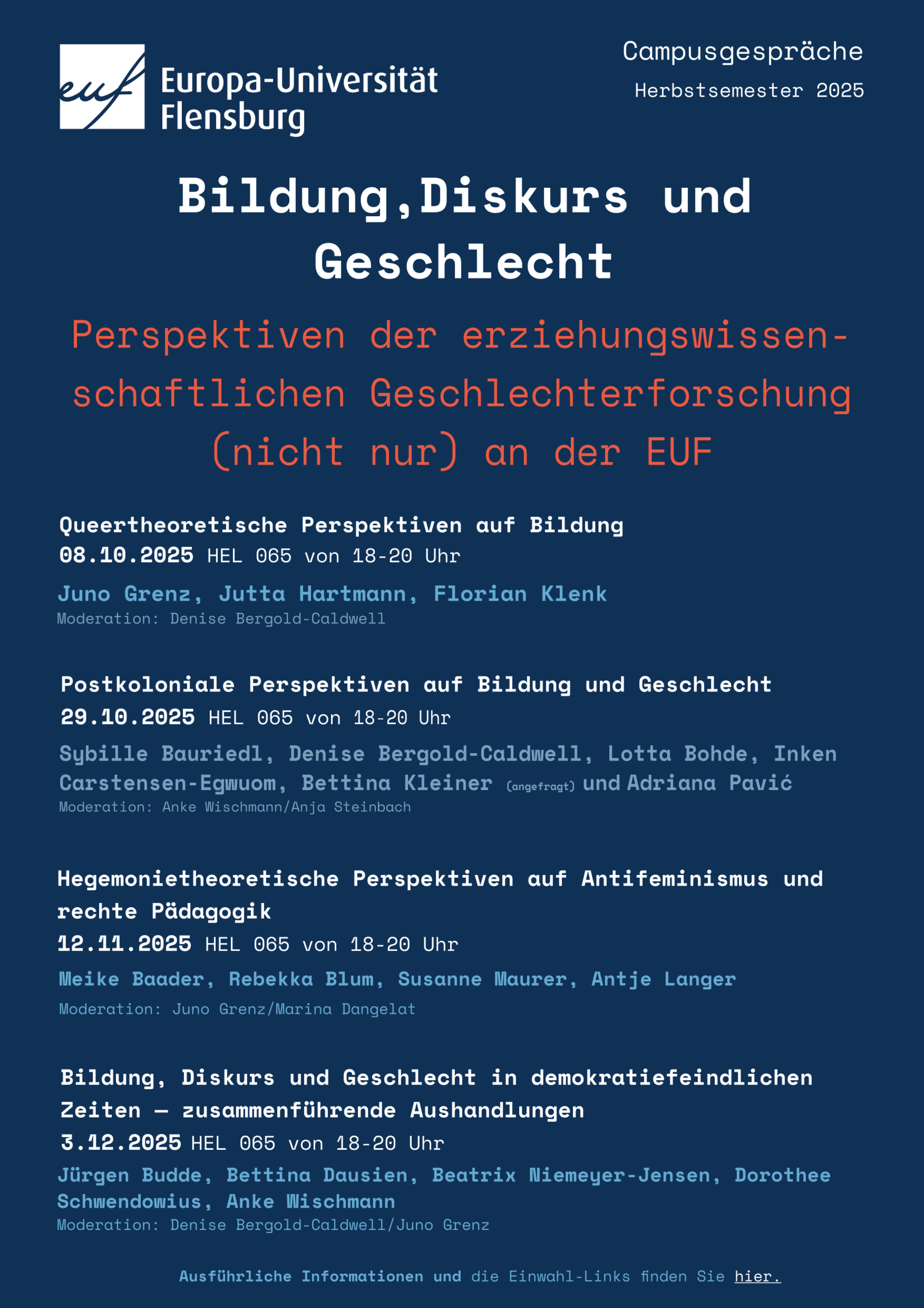 Die Veranstaltungsreihe findet im Rahmen der Campus Gespräche der Europa-Universität Flensburg statt und wird organisiert vom Institut für Erziehungswissenschaften, der Abteilung Integrative Geographie, der Abteilung Deutsch im Kontext von Mehrsprachigkeit und dem Seminar für Geschichte und Geschichtsdidaktik.