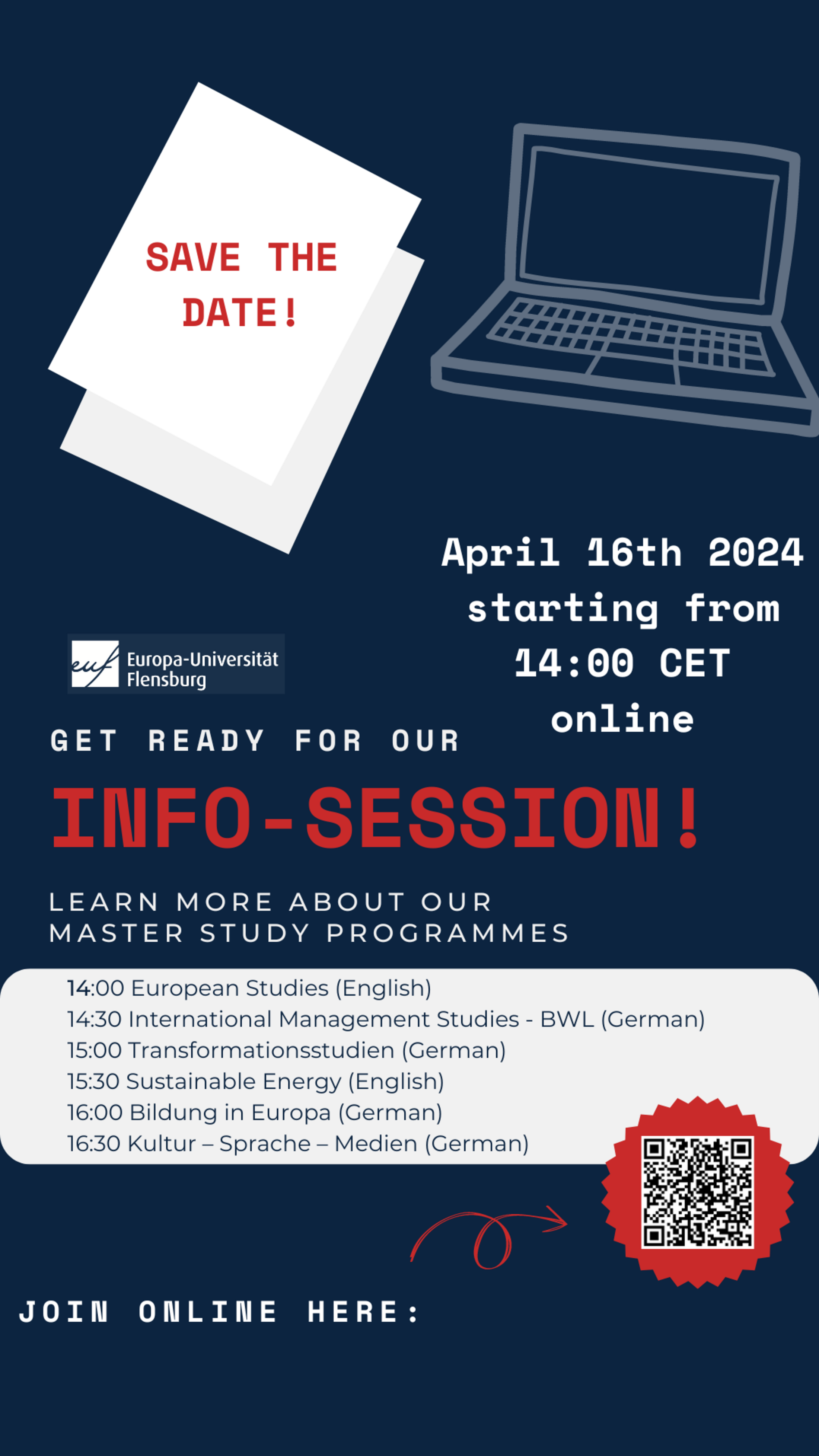 Presentation of the Master programs offered at the EUF: Here you can hear a short presentation from each of the study programs available for you at the Europa-Universität Flensburg. What types of specializations are available in Flensburg? What are the programs all about? What career paths do they open for you? How to apply?... You can take part on April 16th, at 14:00 on Webex: https://uni-flensburg.webex.com/uni-flensburg/j.php?MTID=mb65212b7a7d0c03e2bf97c84fa731c5eThis event is primarily addressed to students of the B.A. European Cultures and Society.