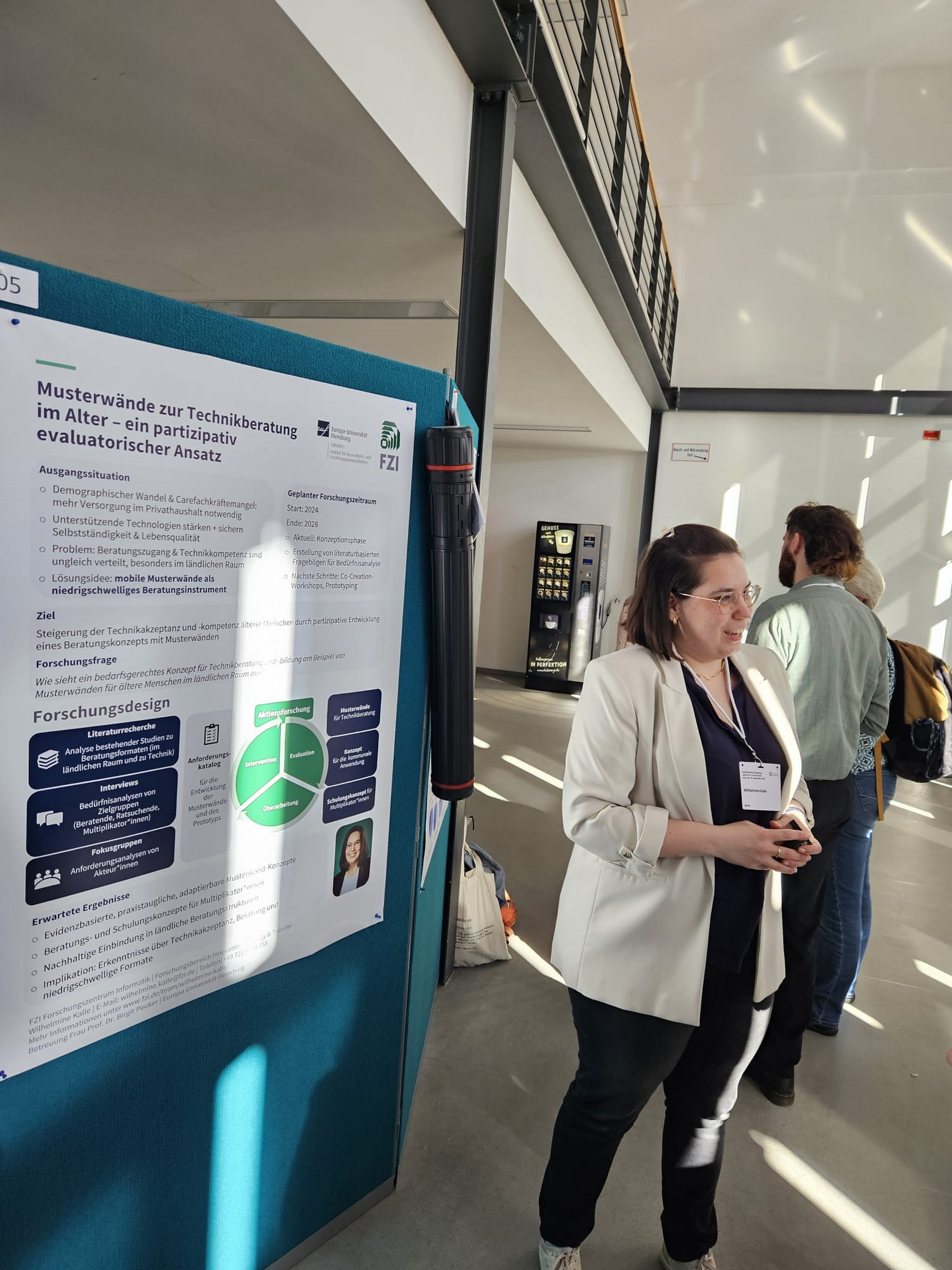 Das Poster mit dem Titel „Musterwände zur Technikberatung im Alter – ein partizipativ evaluatorischer Ansatz“ beschäftigt sich mit der Frage, wie niedrigschwellige Beratungsformate zur Technikberatung älterer Menschen gestaltet werden können. Ziel ist es, Technikakzeptanz und -kompetenz im ländlichen Raum zu stärken und mobile Musterwände als praxisnahes Beratungsinstrument zu entwickeln.