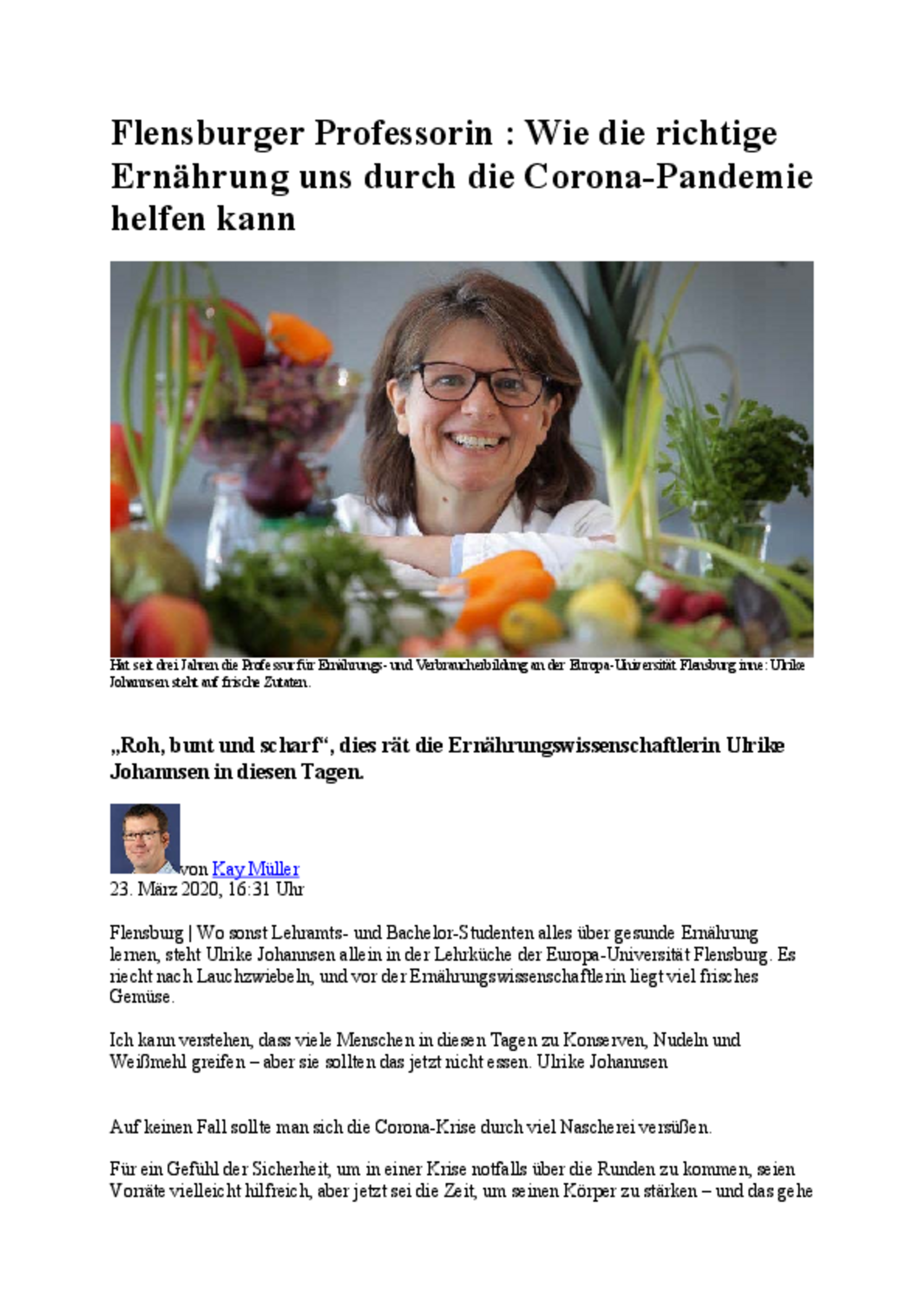 Artikel in der SHZ: Wo sonst Lehramts- und Bachelor-Studenten alles über gesunde Ernährung lernen, steht Ulrike Johannsen allein in der Lehrküche der Europa-Universität Flensburg. Es riecht nach Lauchzwiebeln, und vor der Ernährungswissenschaftlerin liegt viel frisches Gemüse.