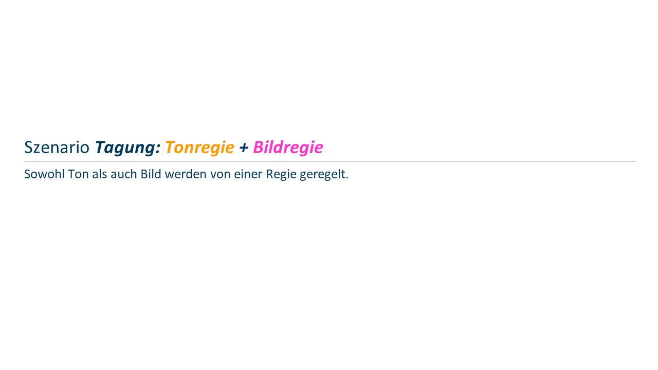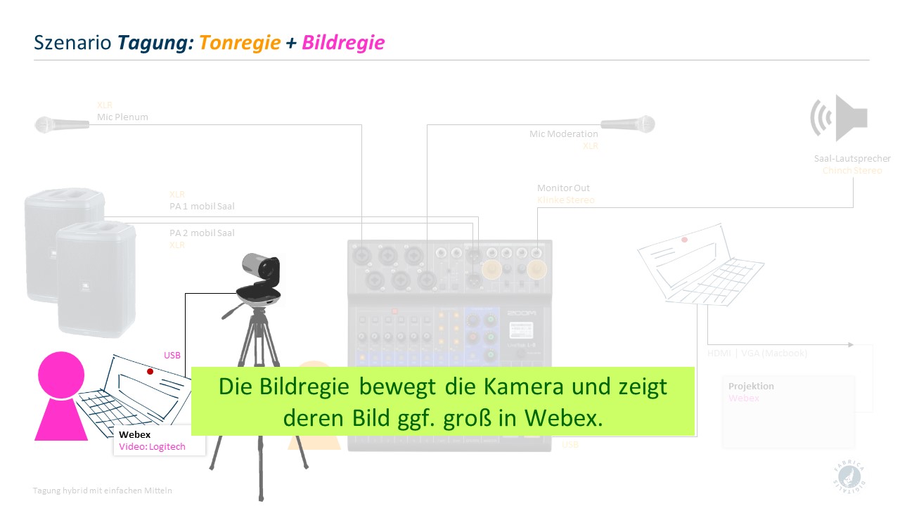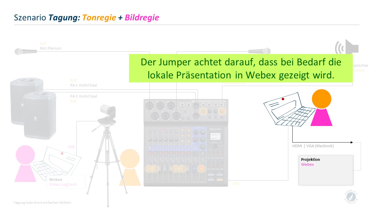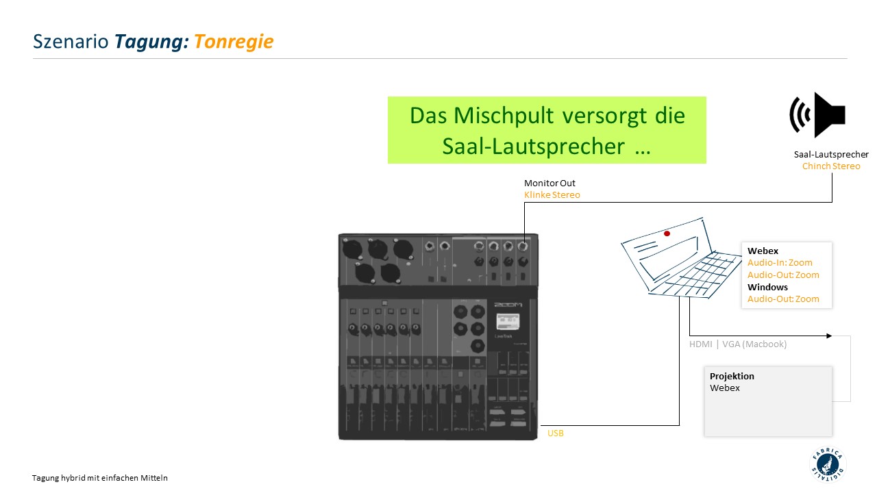 Auf dieser Seite finden Sie Aufbau- und Rollendarstellungen für einfache, selbst organisierte Umsetzungen kleiner Tagungen mit hybriden Anteilen. Der Schwerpunkt liegt hier auf der Tonübertragung zwischen physischem und Online-Plenum.