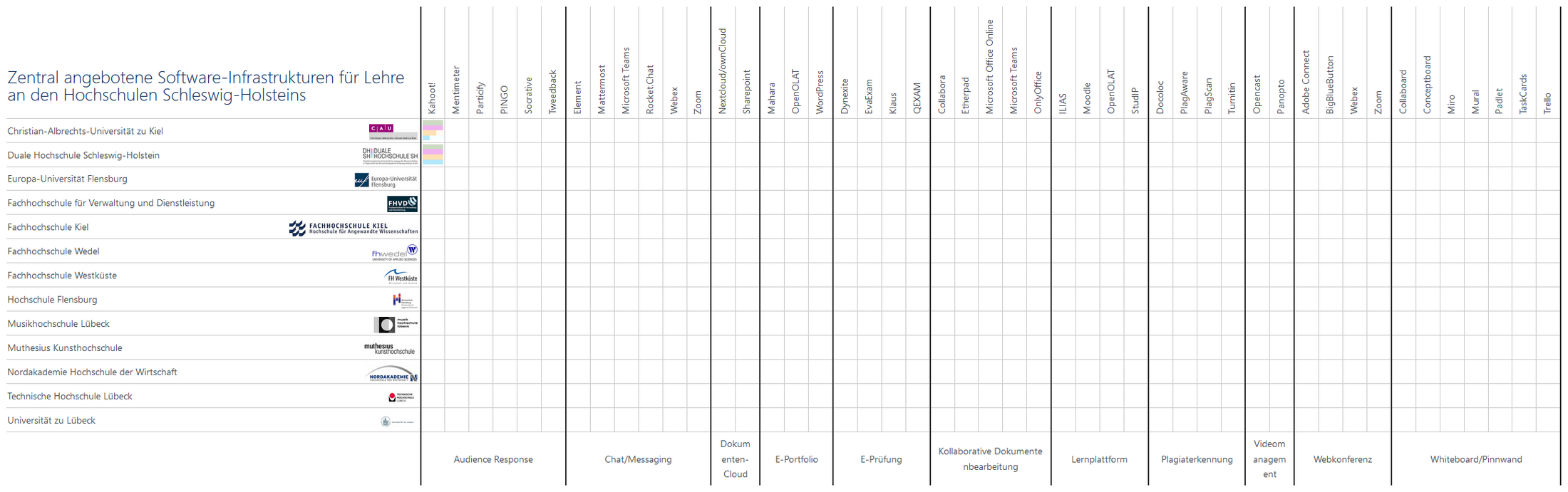 Im Rahmen von eDi@SH ist FabricaDigitalis an der Erstellung einer Übersicht zum Status von Software-Infrastruktur für Lehre beteiligt, die an den Hochschulen Schleswig-Holsteins jeweils zentral (also nicht nur für einen bestimmten Fachbereich) angeboten wird.