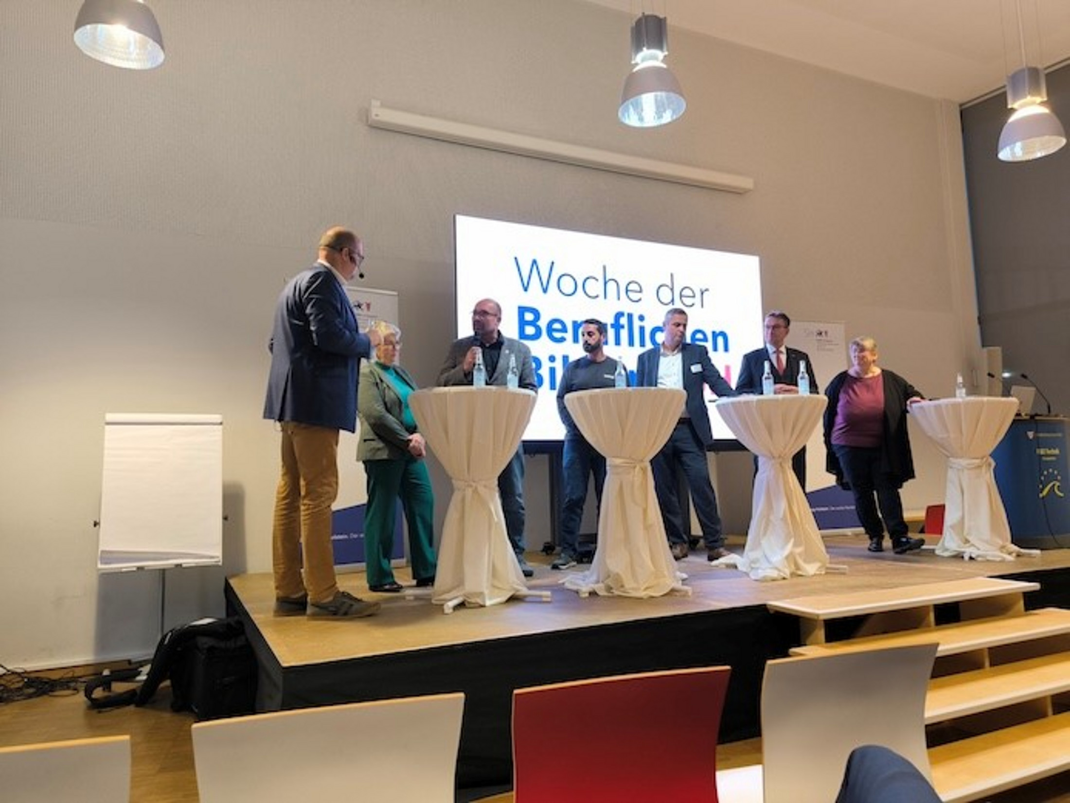 Nach einem anregenden Vortrag von Frau Dr. Achtenhagen zu zwei KI-Projekten in Stuttgart gab es eine Podiumsdiskussion zu KI in der beruflichen Bildung. Die Diskutanten waren sich schnell einig, dass KI auch Auswirkungen auf die berufliche Bildung haben wird und dass Lehrende und Lernende mit KI-Kompetenzen ausgestattet werden müssen, damit verantwortungsbewusst, nachhaltig und reflektiert mit der neuen Technik umgegangen werden kann.