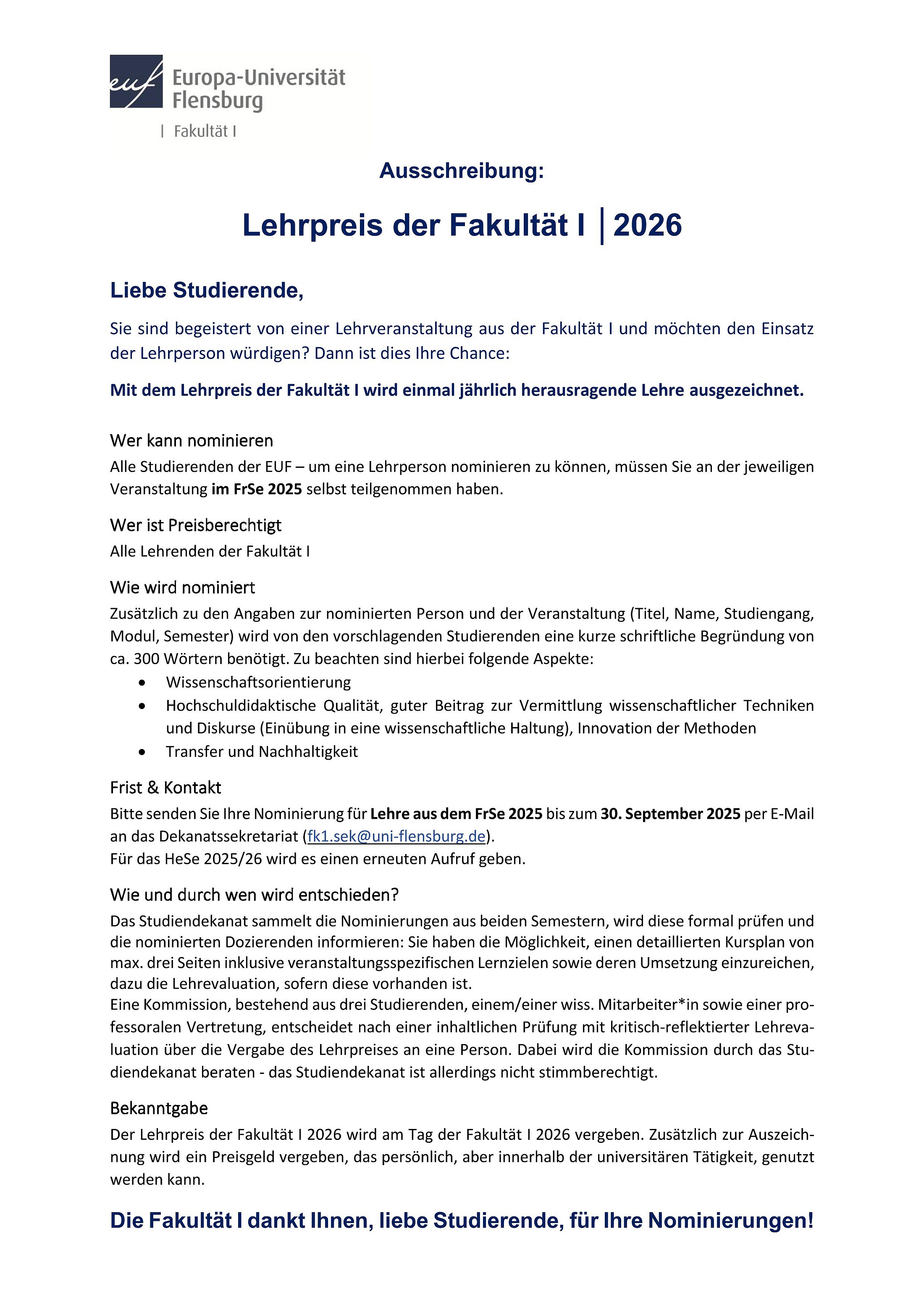 Ausschreibung Lehrpreis 2026 (FrSe 25)