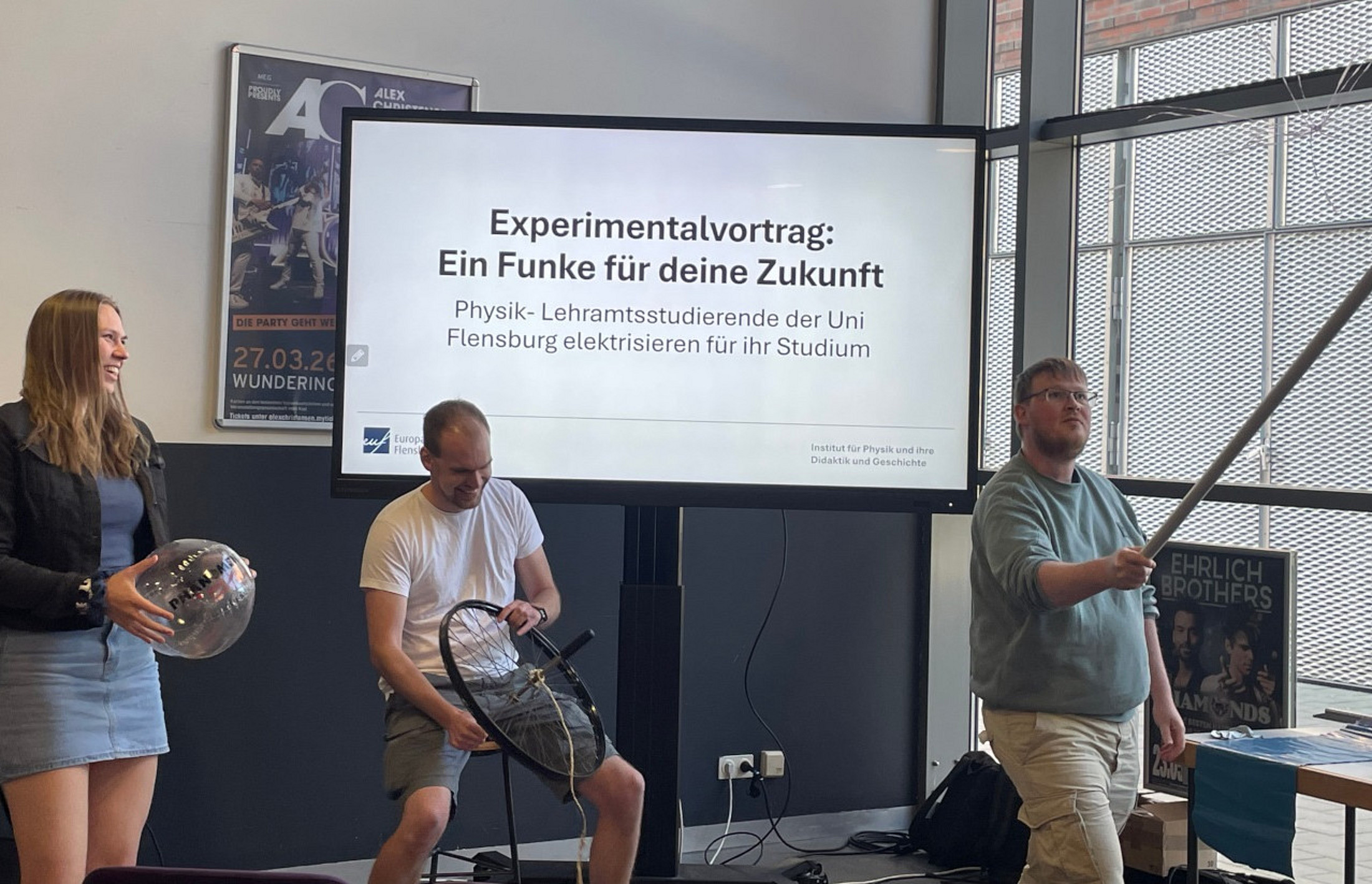 Engagierte Physik-Lehramtsstudierende der EUF haben am 13. und 14. Mai 2025 auf der Vocatium in Kiel, einer Fachmesse für Ausbildung und Studium, mit zwei interaktiven Experimentalvorträgen die Anwesenden für ihr Studium und den Beruf der Physiklehrkraft an einer Gemeinschaftsschule elektrisiert. Das Institut bedankt sich sehr herzlich bei den Studierenden für ihr außerordentliches Engagement und ihren lebhaften, inspirierenden Beitrag.