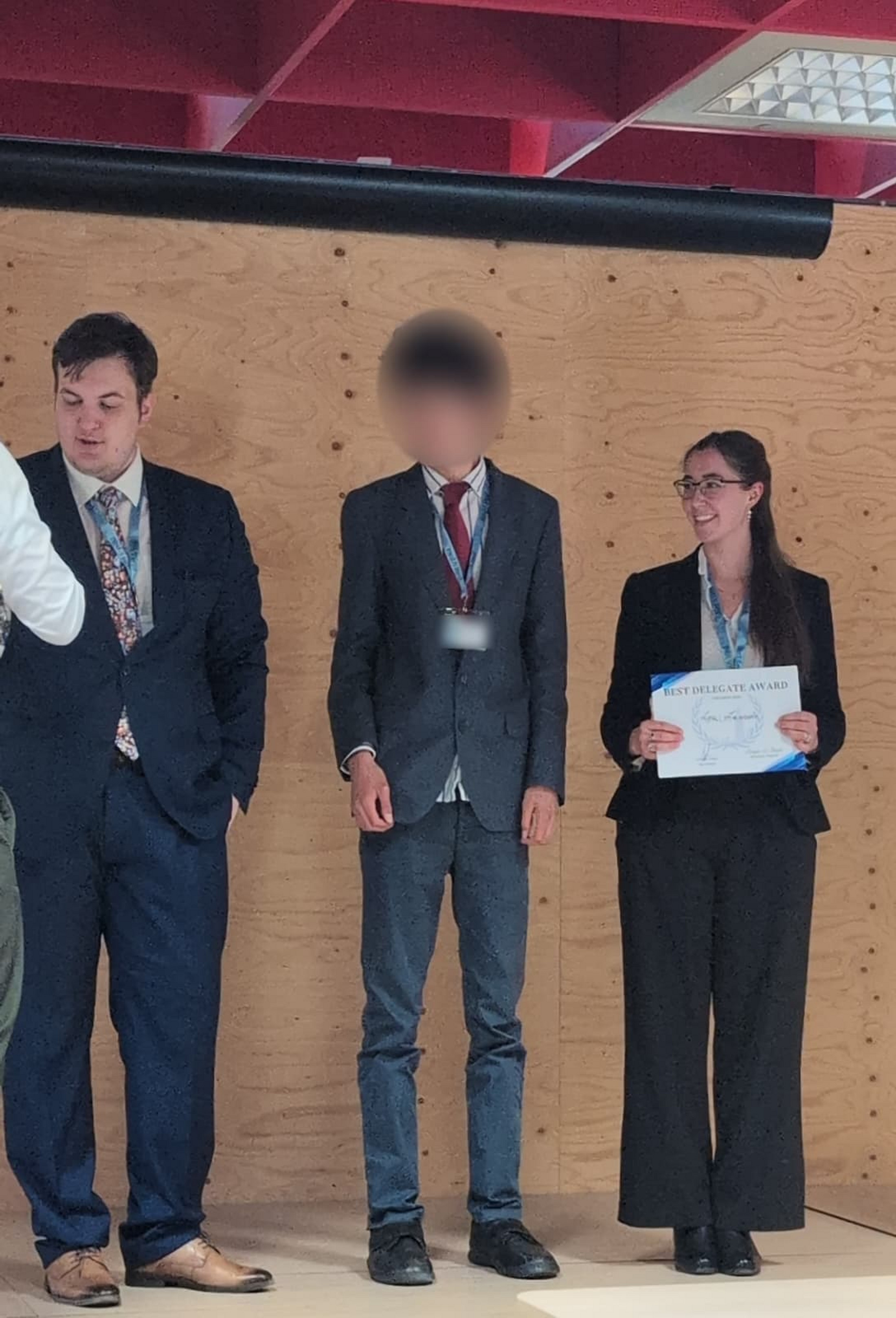 - Yelyzaveta: "This was my first experience participating in a MUN, and I can confidently say that it is truly a unique opportunity for any student who wants to enhance their debating skills while broadening their understanding of current global issues addressed within the United Nations system. The event was organized in an extremely efficient manner, allowing for a balance between engagement in committee sessions and participation in social activities, where there was an opportunity to meet representatives from other committees, brought together by people from different corners of the world."