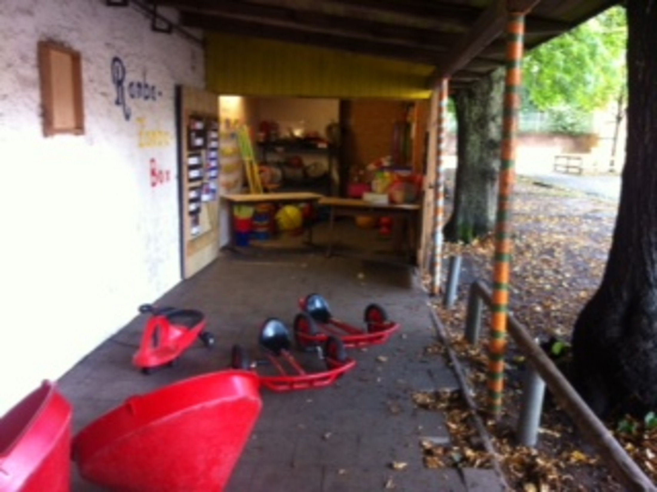 Zusätzlich wird die "Ramba-Zamba-Box" an mehreren Schultagen in den großen Pausen geöffnet. Die "Ramba-Zamba-Box" bietet den Schüler und Schülerinnen in den Pausen die unterschiedlichsten Spielgeräte zum Ausleihen an. Von Gummitwist, Bällen, Stelzen und Softtennis kann alles ausgeliehen werden. Auch hier wird der Peer-Education- Ansatz genutzt und die älteren Schüler helfen bei dem Verleih der Spielgeräte mit und übernehmen so Verantwortung.