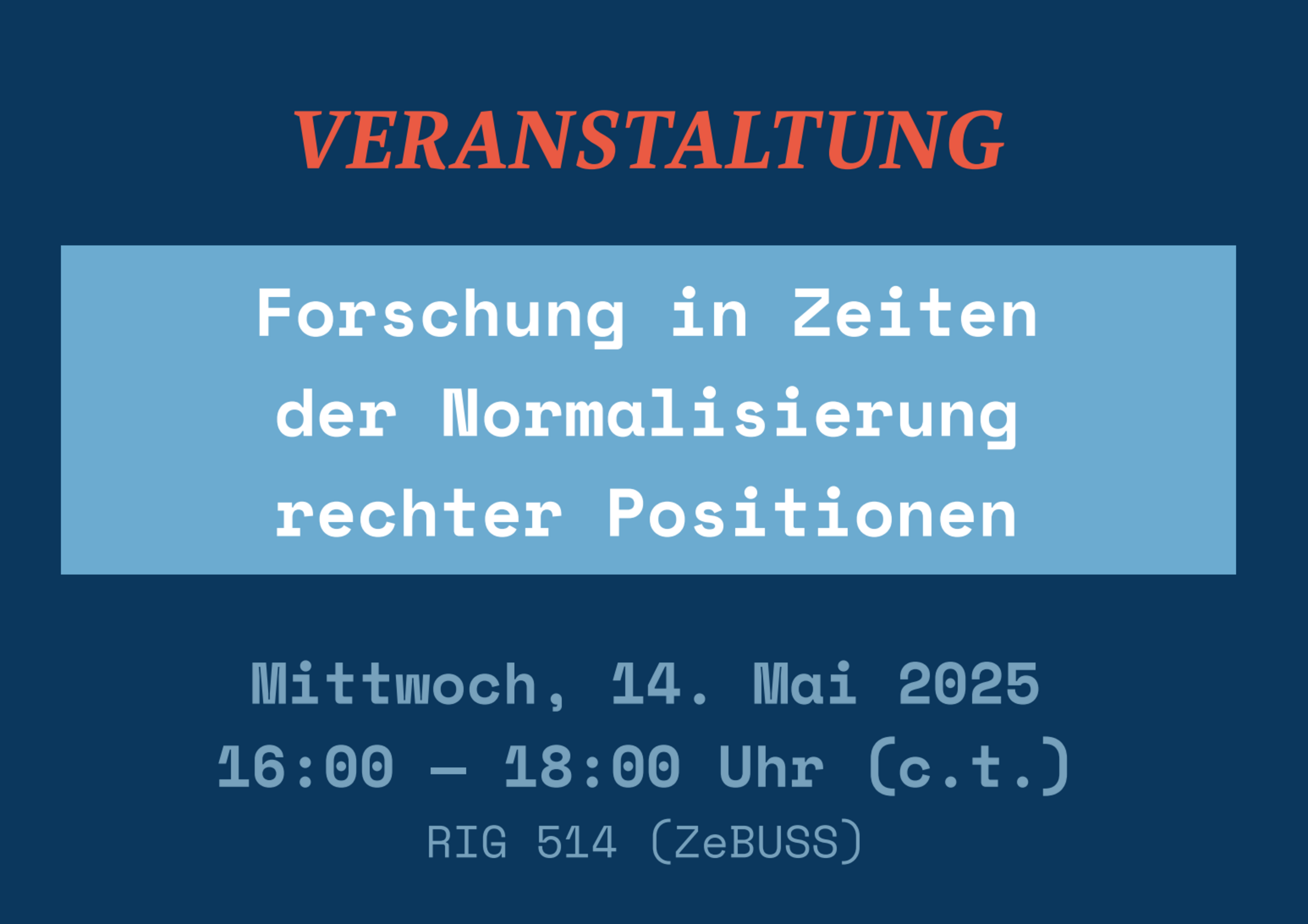 Dass wissenschaftliche Forschung in gesellschaftlichen Wandel eingebunden ist und sich zugleich mit den eigenen Verstrickungen in gesellschaftliche Verhältnisse auseinandersetzen muss, ist ein Allgemeinplatz. Doch was bedeutet es für die Forschung, die Forschenden und auch die Beforschten, wenn es zur Normalisierung rechter Positionen sowohl in den Forschungsfeldern als auch in wissenschaftlichen Kontexten kommt und dadurch demokratische Rechte, Praxen und Versprechen von Gesellschaft grundlegend infrage gestellt und bekämpft werden? Über Impulsvorträge aus drei am ZeBUSS angesiedelten Forschungsprojekten zu Rechtsextremismus in Wissenschaft und Hochschule, zu Institutionellem Rassismus in der Schule und zur Re-Autorisierung hegemonialer Männlichkeit wollen wir diese Frage im Rahmen der Veranstaltung aufgreifen und auch mit den Teilnehmenden diskutieren.
