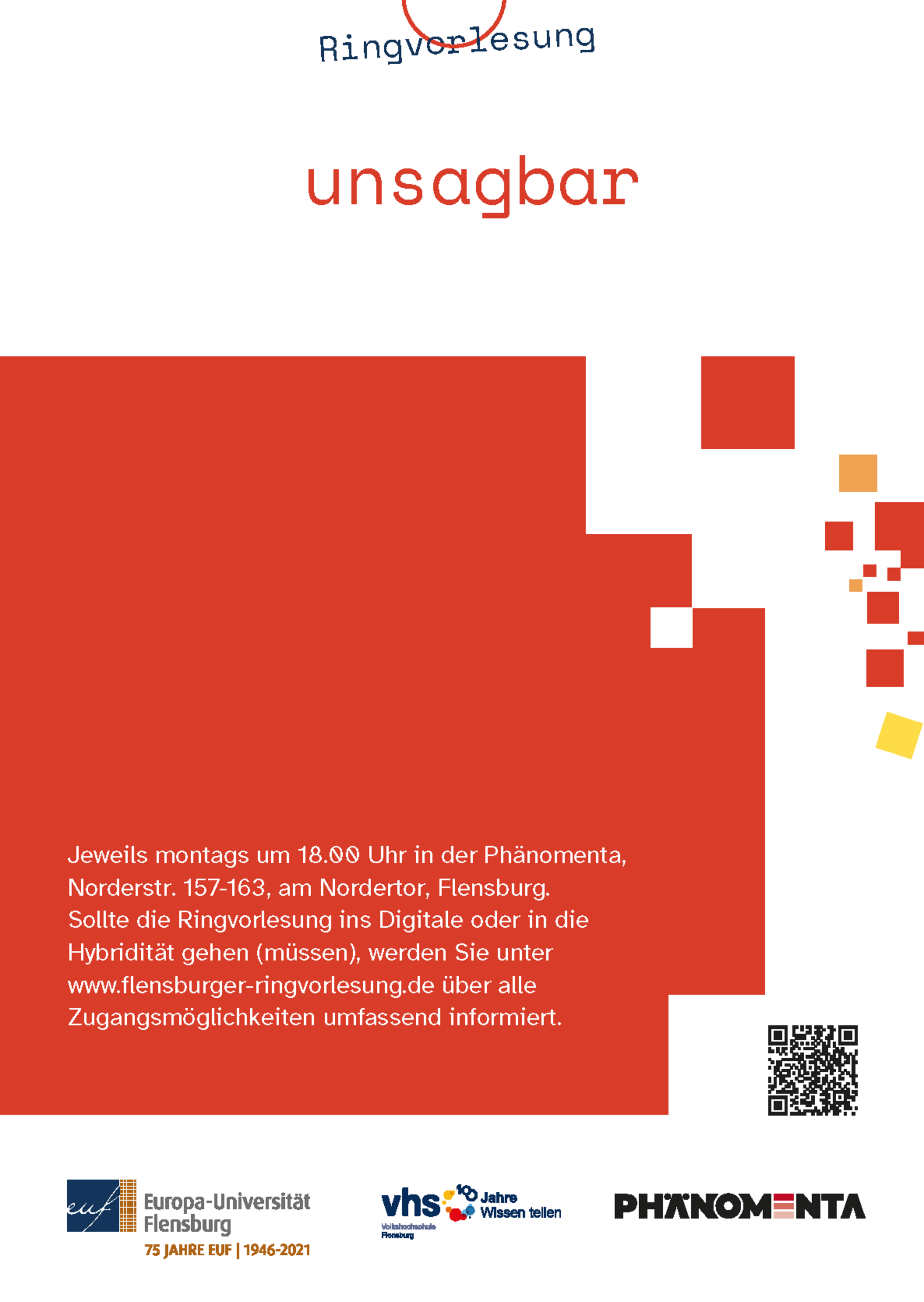 Die Flensburger Ringvorlesung wird gemeinsam von der Abteilung Physik und der Abteilung Anglistik und Amerikanistik organisiert. Sie findet seit 2013 mit einem jährlich wechselndem Oberthema in Kooperation mit der Phänomenta und der Flensburger Volkshochschule im Vortragssaal der Phänomenta statt. Das Thema der diesjährigen Reihe ist "unsagbar" – es soll dazu eingeladen werden, einige Grenzen auszuloten, die sich der Wissenschaft stellen: Was ist Sagbar innerhalb der Disziplin, was ist unsagbar, was unsäglich und wo versagt die Disziplin vor Fragen – vielleicht auch, weil diese außerhalb des Gegenstandsbereichs dieser Fragen liegen. Wie verändert sich das, was sagbar ist, wie wird ehedem sagbares zu unsagbaren/unsäglichem, und wie wird unaussprechliches vielleicht doch Teil des wissenschaftlichen Diskurses? Dies sind Fragen, mit denen sich die Vorträge der Ringvorlesung beschäftigen werden.