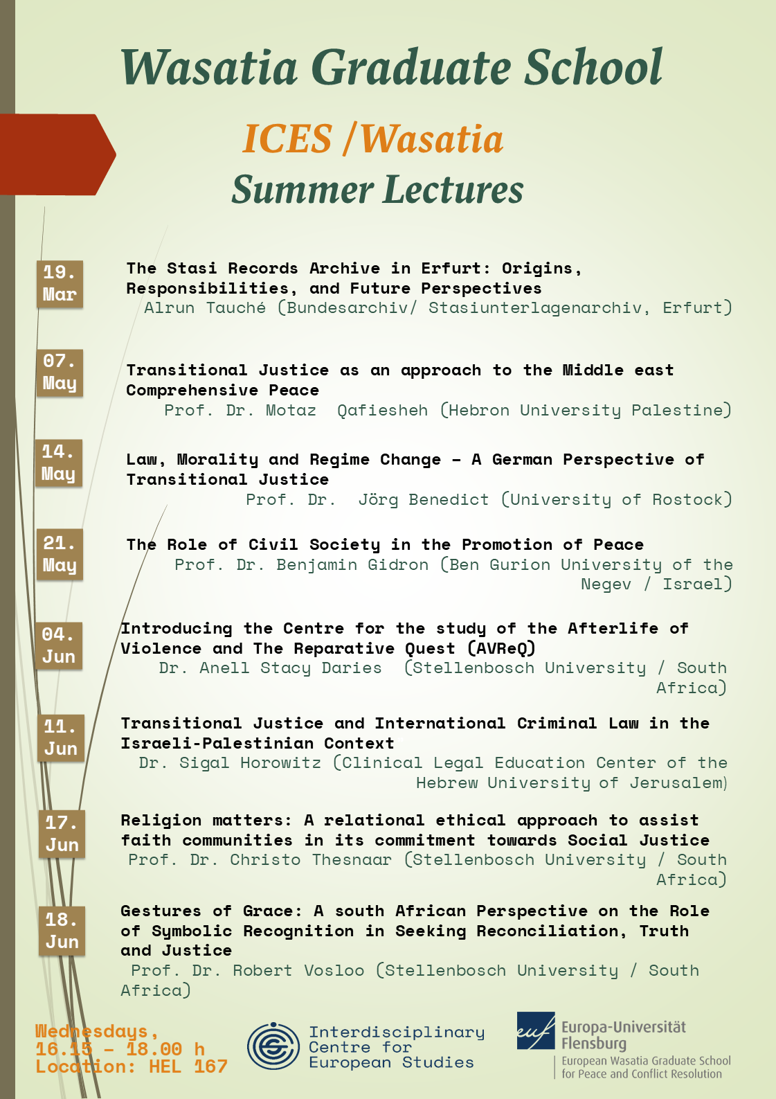 The Wasatia/ICES Summer Lectures at Europa-Universität Flensburg bring together leading scholars from across the globe to explore the intersections of justice, reconciliation, and peace-building. Covering critical themes such as transitional justice, regime change, civil society’s role in peace promotion, and the legacy of state surveillance, this series fosters a deeper understanding of historical injustices and their modern implications. Experts from Germany, Palestine, Israel, and South Africa will share insights on confronting systemic oppression, addressing legal and moral responsibilities, and fostering dialogue between divided communities. By examining past conflicts and reconciliation efforts, the lectures aim to provide transformative lessons for contemporary global challenges. Taking place weekly, this interdisciplinary platform invites students, academics, and the public to engage in meaningful discussions on justice and peace.