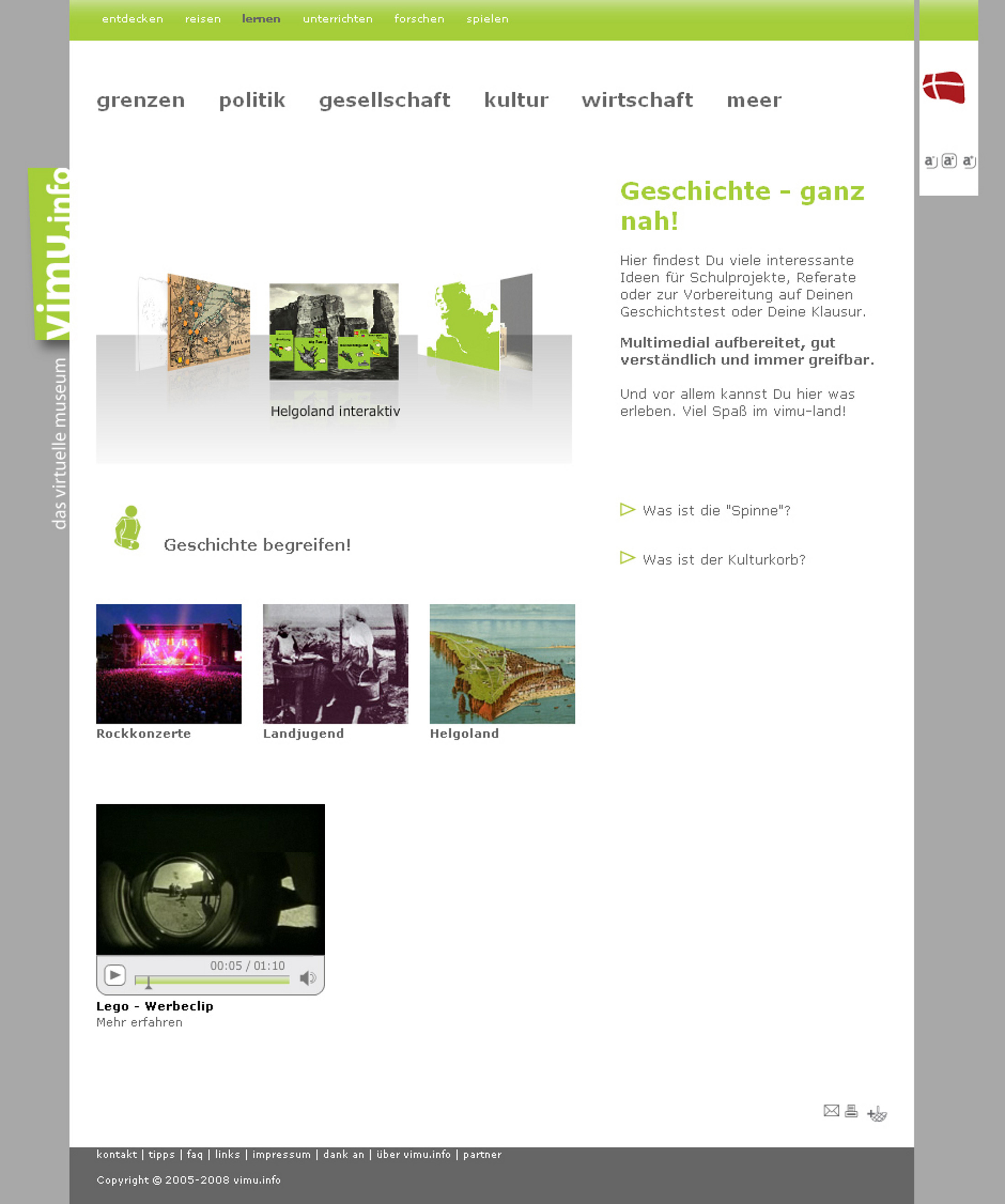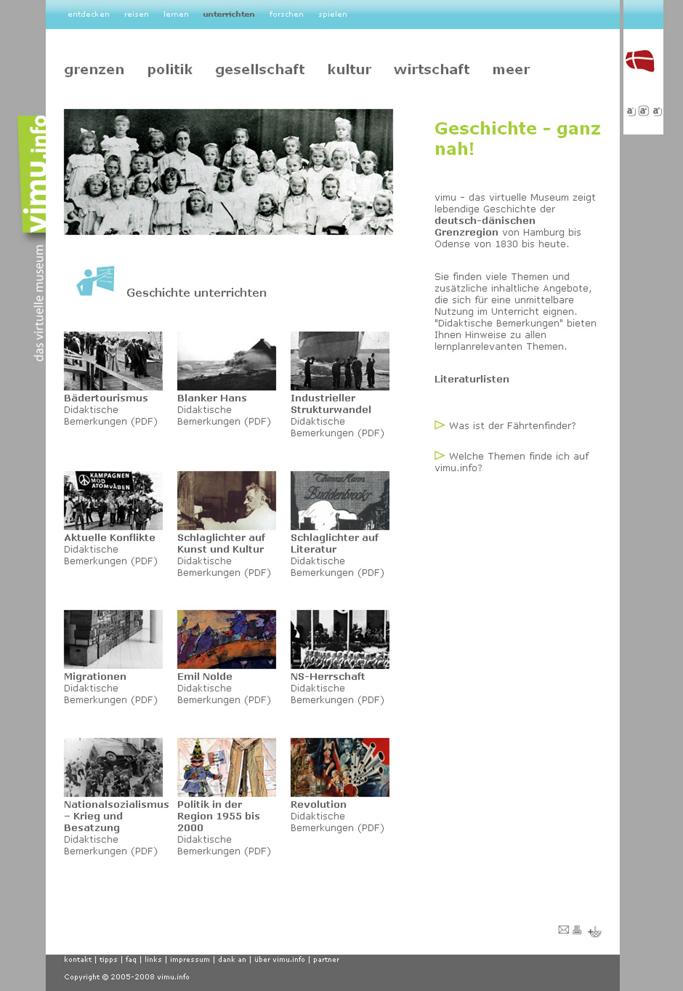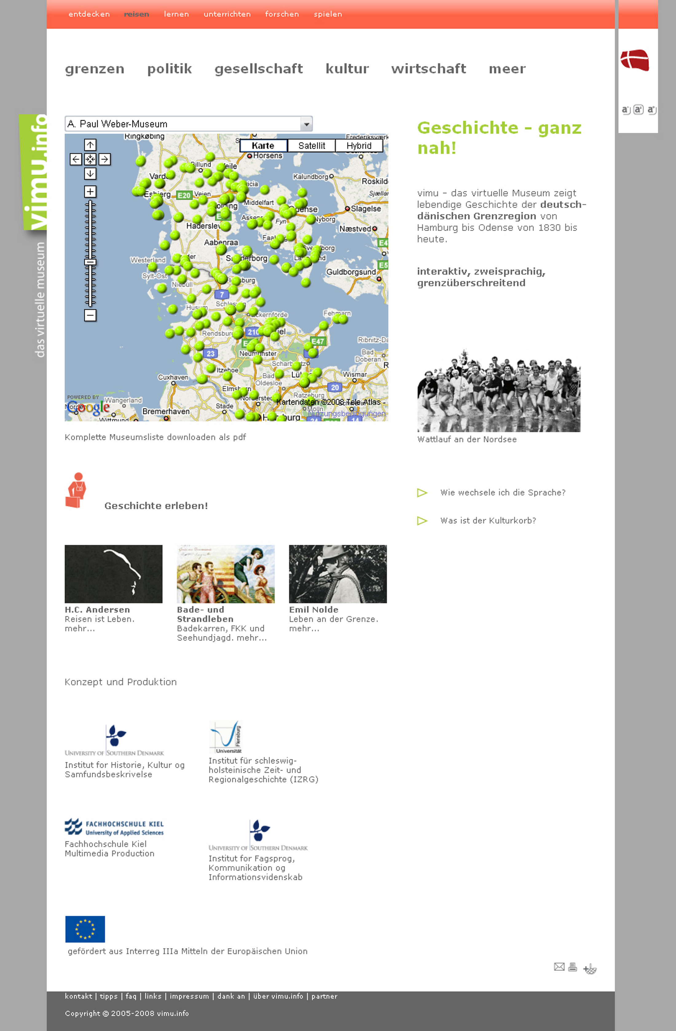 Gefördert durch EU-Interreg-Mittel erarbeitete die Vorgängerinstitution der frzph (IZRG) mit drei Hochschulen in Schleswig-Holstein und Süddänemark zwischen 2005 und 2008 das zu diesem Zeitpunkt innovative virtuelle Museum Vimu.info zur multimedialen Vermittlung der transnationalen Geschichte der deutsch-dänischen Grenzregion. Ein begleitendes Forschungsprojekt umfasste neben fachdidaktischer und medientheoretischer Fundierung der Konzeption die Evaluation der Nutzung der Website durch Besucher:innen. Vimu.info war konstant online, bis der technische Fortschritt in 2024 Updates unmöglich machte.