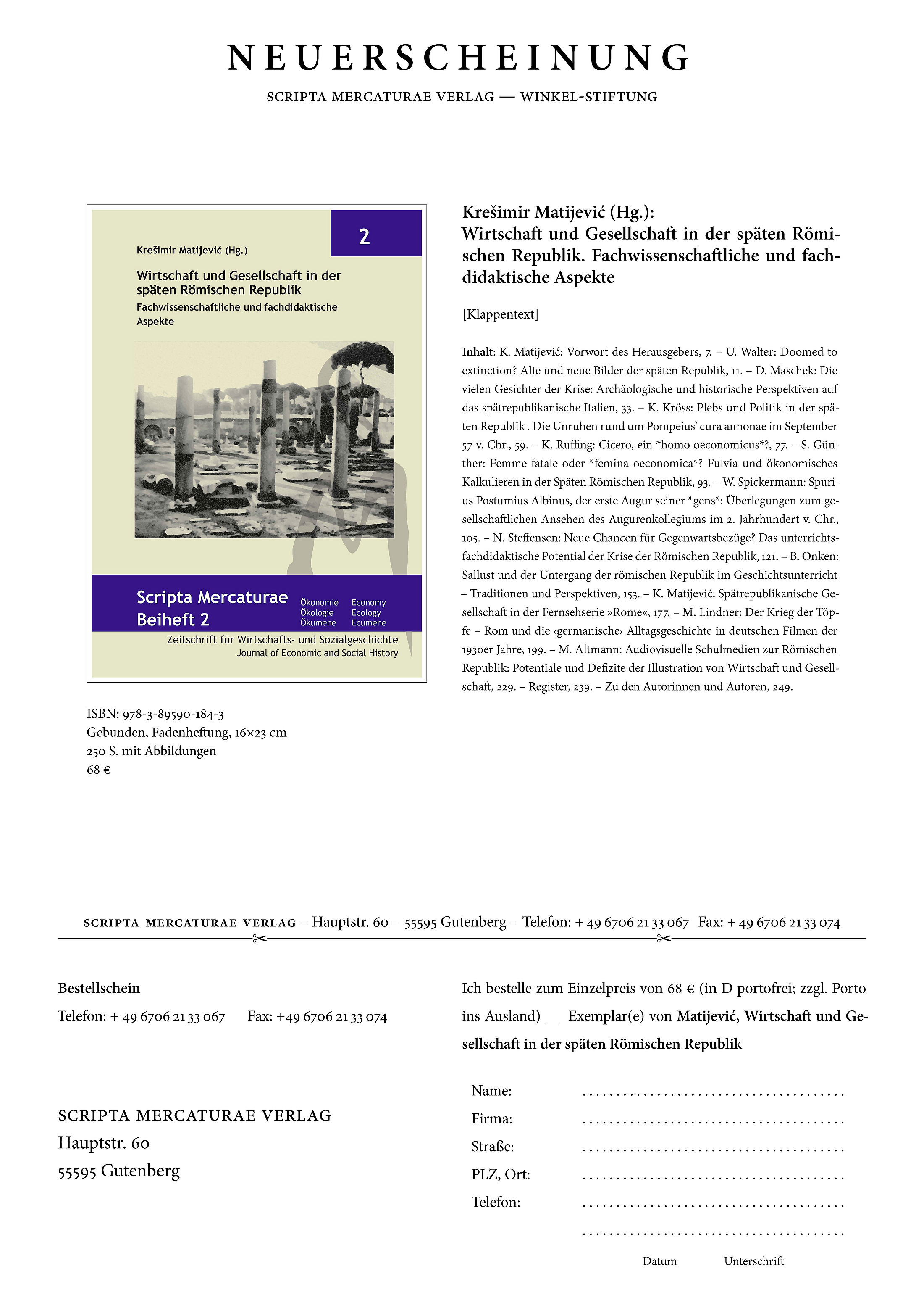 Der Band ist das Ergebnis einer Tagung unter demselben Titel, die am 21. und 22. März 2019 an der Europa-Universität Flensburg stattfand. Ein prominent besetztes Feld an WissenschaftlerInnen aus dem In- und Ausland präsentiert neue Forschungsergebnisse zu Wirtschaft und Gesellschaft in der späten Römischen Republik und zur Nutzung dieser Thematik im schulischen Unterricht.