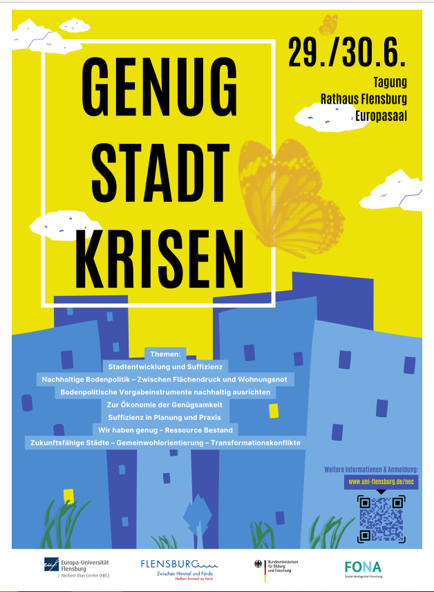 Im Zentrum der Tagung stehen Perspektiven sowohl aus der Wissenschaft als auch aus der (kommunalen) Praxis. Denn die Tagung ist die Abschlussveranstaltung des transdisziplinären Forschungsprojektes "Entwicklungschancen und -hemmnisse suffizienzorientierter Stadtentwicklung" (EHSS). Sie wird gemeinsam vom Norbert Elias Center for Transformation Design & Research (NEC) der Europa-Universität Flensburg und der Stadt Flensburg organisiert und durch das Bundesministerium für Bildung und Forschung (BMBF) gefördert.