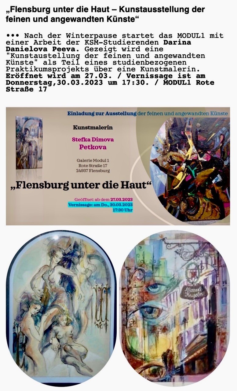 Nach der Winterpause startet das MODUL 1 der Europa-Universität Flensburg (EUF) mit einer Ausstellung der Studentin Danielova Peeva. Sie studiert Kultur-Sprache-Medien an der EUF. Gezeigt wird eine "Kunstaustellung der feinen und angewandten Künste" als Teil eines studienbezogenen Praktikumsprojekts einer Kunstmalerin.