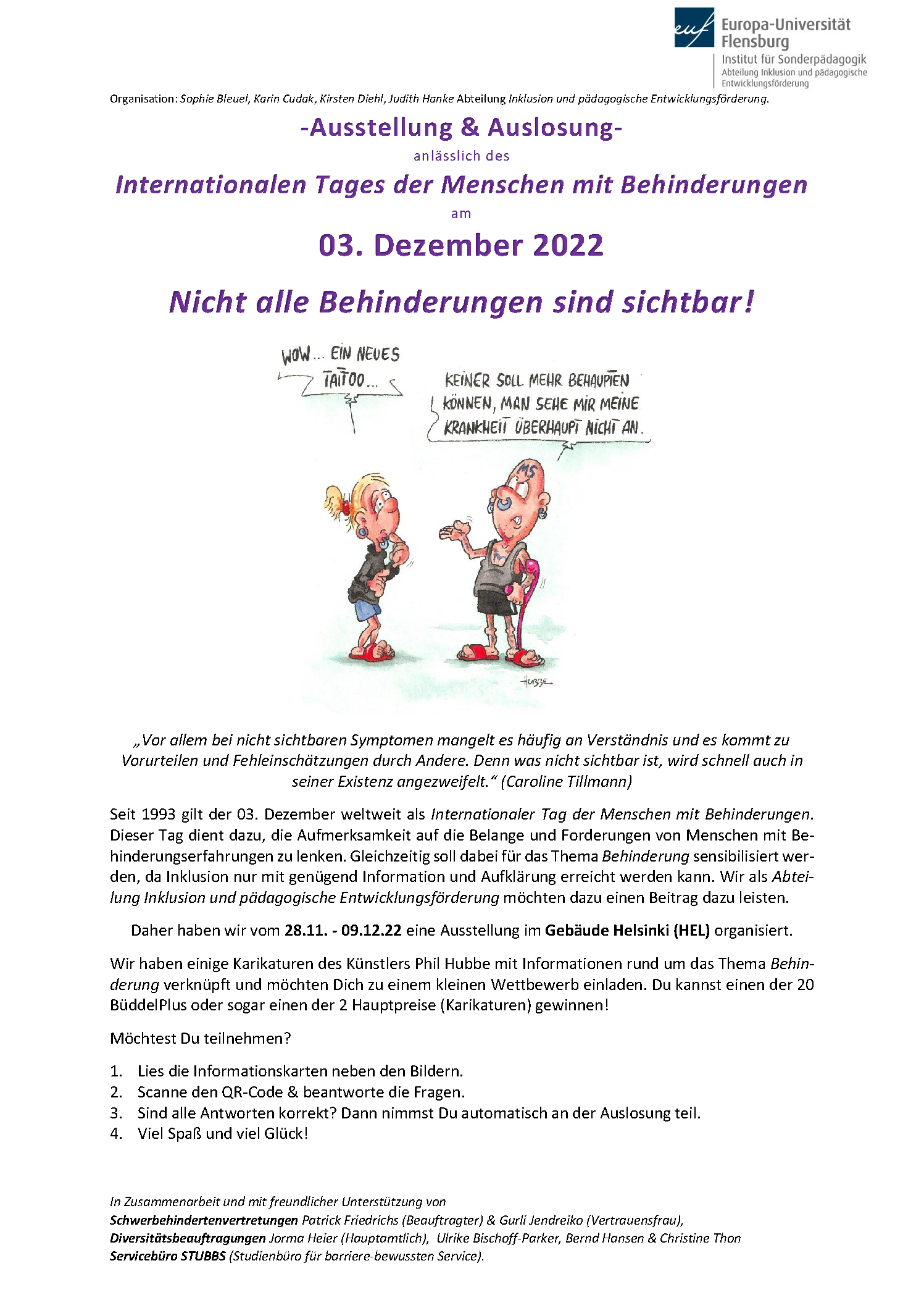 Die Abteilung Inklusion und pädagogische Entwicklungsförderung der EUF lädt dazu vom 28.11. - 09.12.22 zu einer Ausstellung mit Karikaturen des Künstlers Phil Hubbe ein. Außerdem wird es einen kleinen Wettbewerb geben, zu gewinnen gibt es 20 BüddelPlus und 2 Hauptpreise (Karikaturen): Dazu wurden einige Karikaturen des Kpnstlers mit Informationen rund um das Thema Behinderung verknüpft.