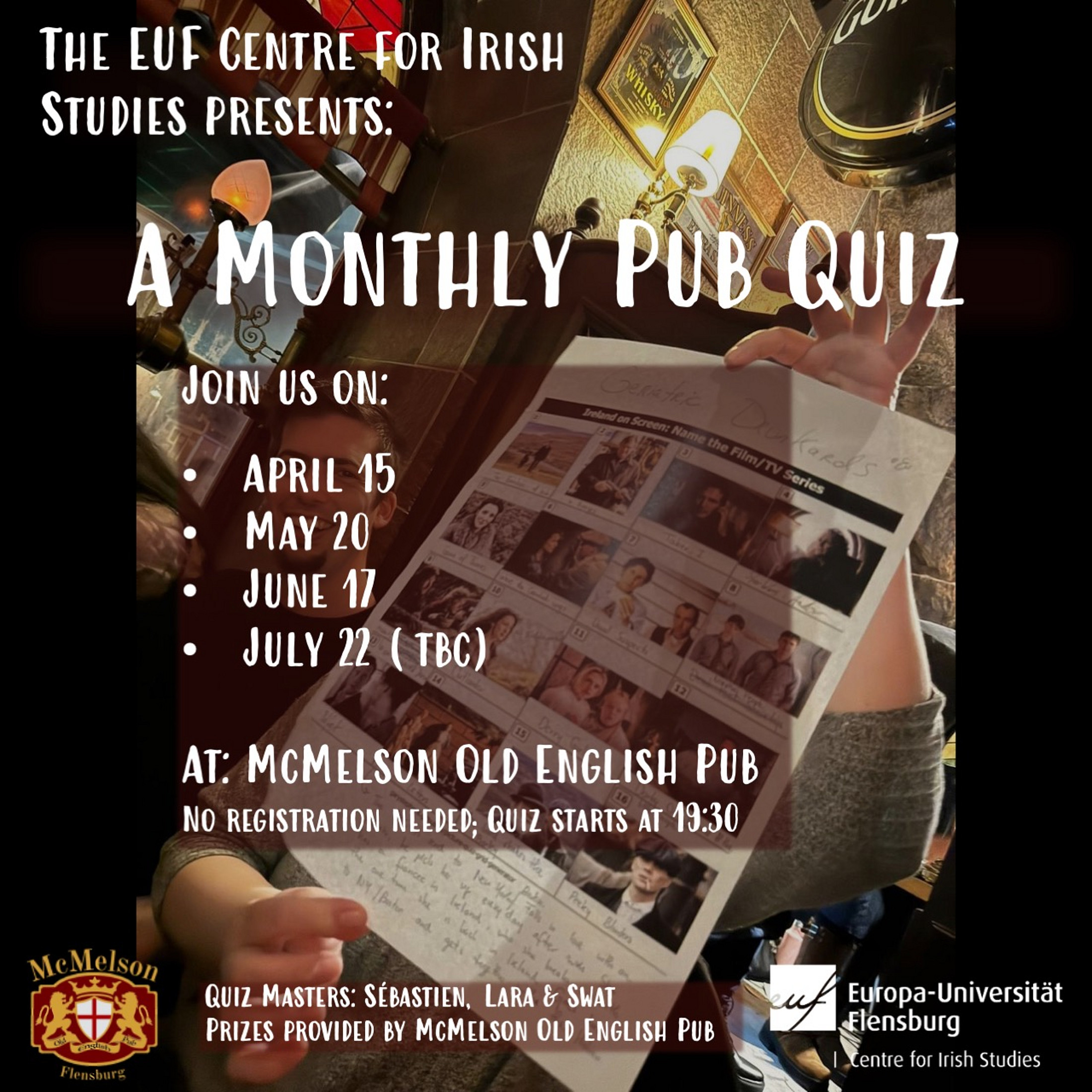 The quiz will start at 19:30, so come early to secure your table and drinks beforehand. The prizes will be provided by McMelson's and the quiz masters are members of the EUF Centre for Irish Studies, Sébastien, Lara, and Swat. For more information, please feel free to email michelle.witen@uni-flensburg.de