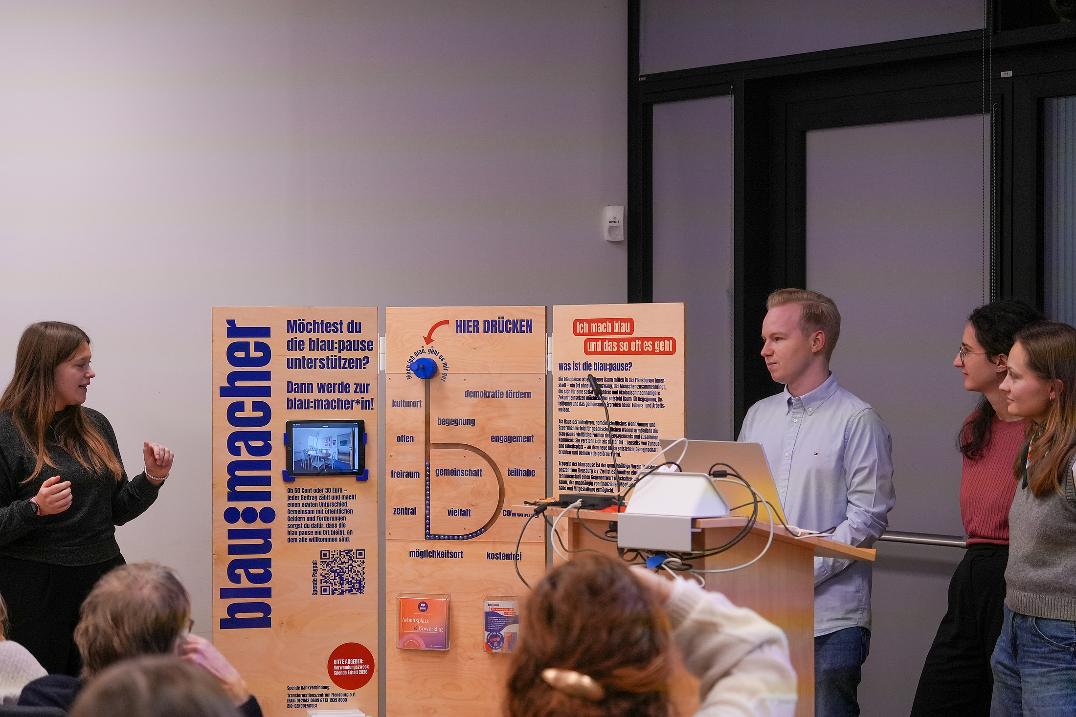 Für die blau:pause – Transformationszentrum Flensburg e.V., einen offenen Begegnungsort für Kultur, Engagement und Austausch, erarbeiteten die Studierenden ein neues Finanzierungsmodell. Zudem setzten sie ein Spendentool um, das Besucherinnen und Besuchern eine freiwillige Unterstützung der Räumlichkeiten ermöglicht, ohne das kostenfreie und niederschwellige Konzept zu verändern. „Diese Spenden helfen der blau:pause, die laufenden Ausgaben zu decken und Eigenmittel aufzubauen, die wiederum eine wichtige Voraussetzung für die Einwerbung von Drittmitteln sind“, erläutert Sarah Kipp, Vereinsmitglied der blau:pause.