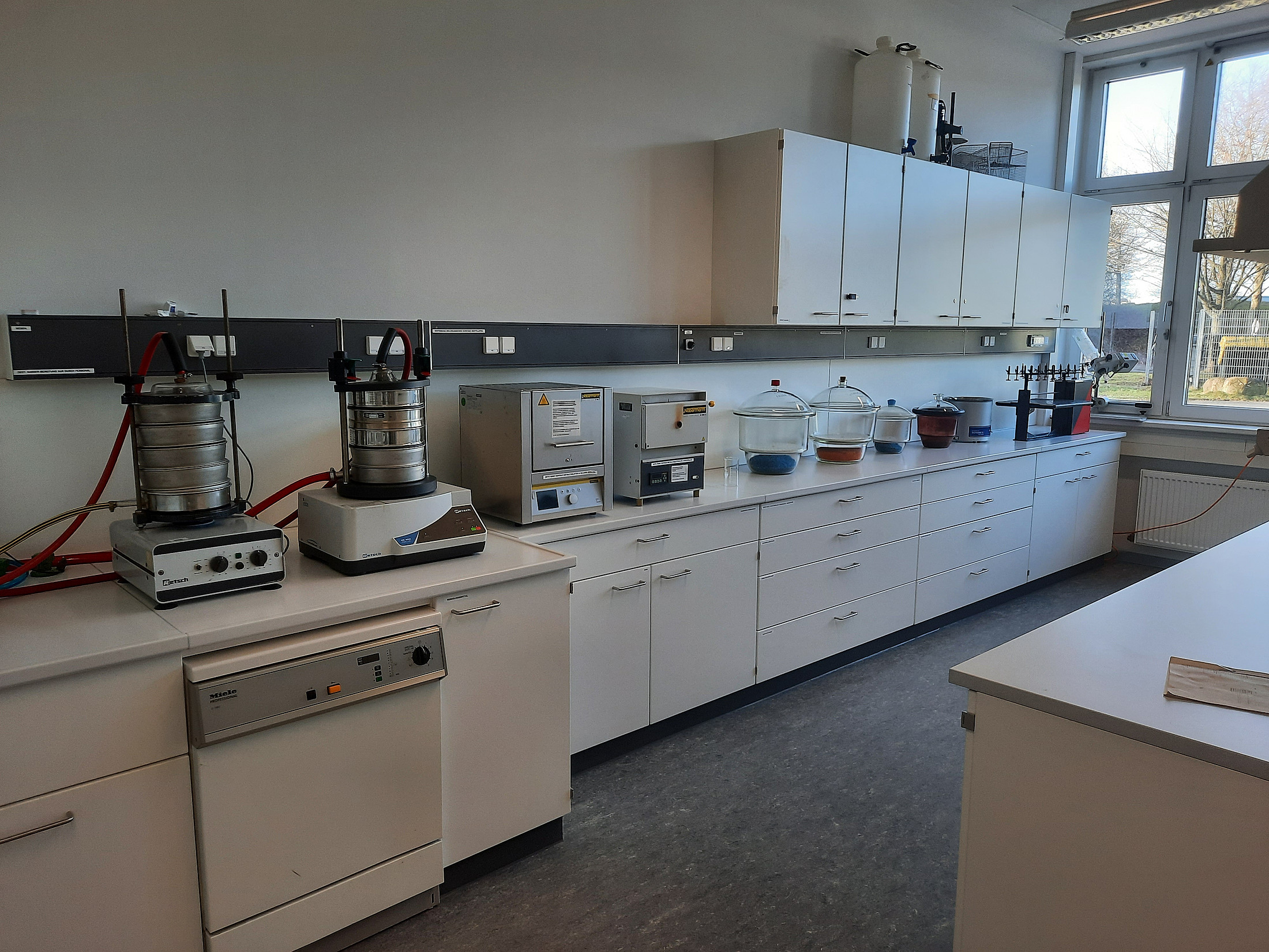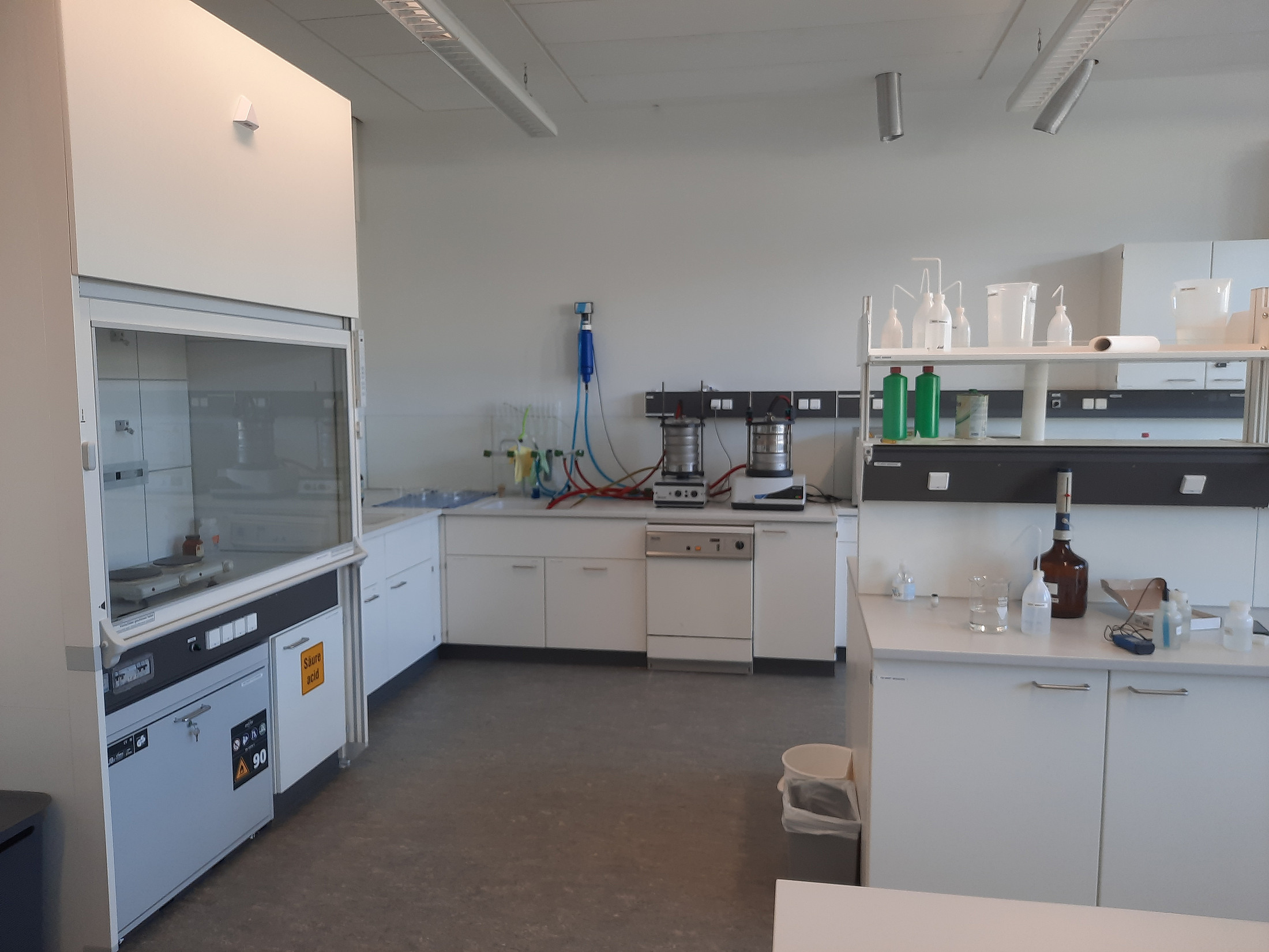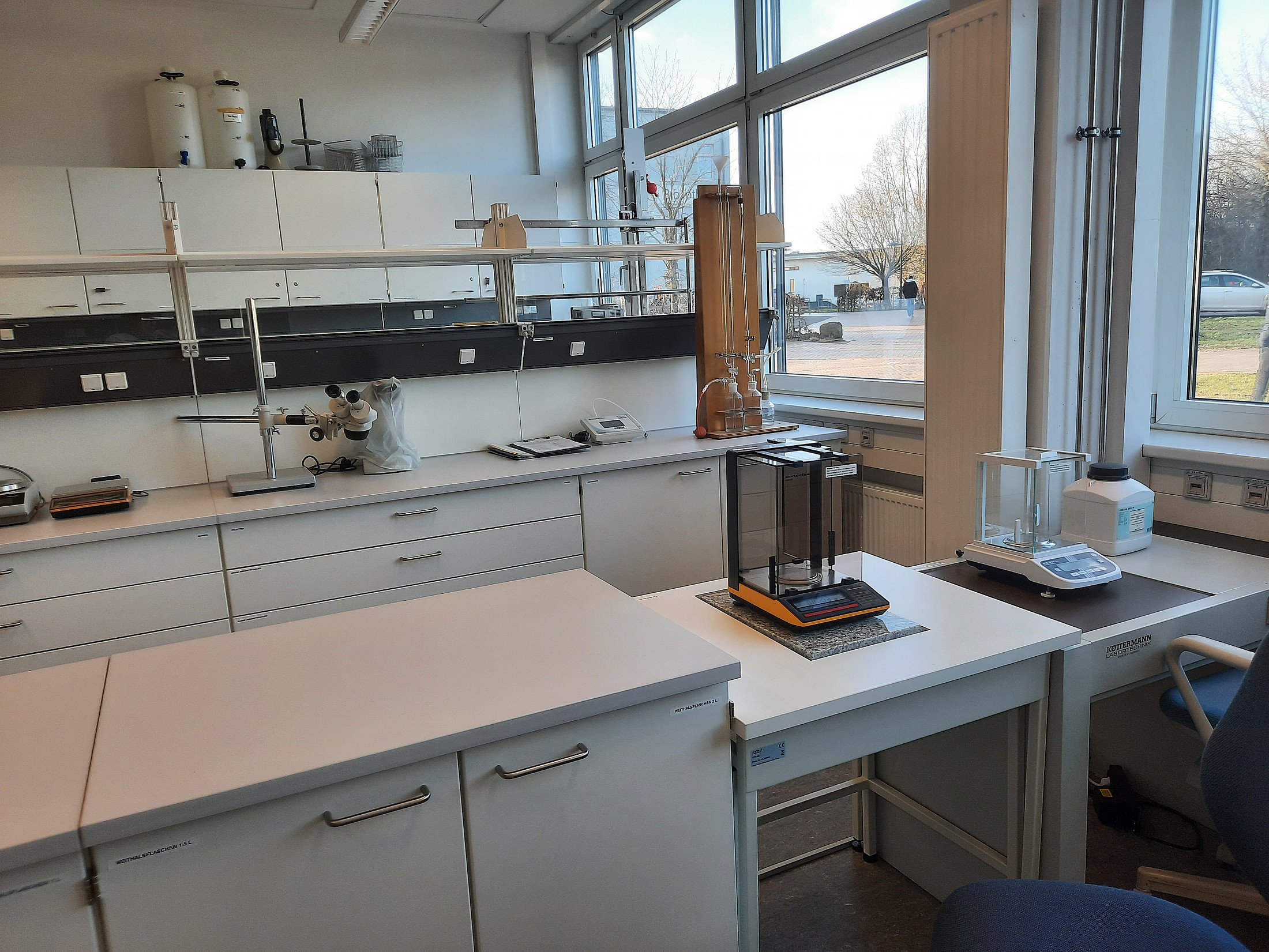 Das Labor besteht aus einem Hauptraum, in dem 5-8 Personen gleichzeitig arbeiten können, über einen Lager- und einen separaten Schmutzraum zur Probenaufbereitung.