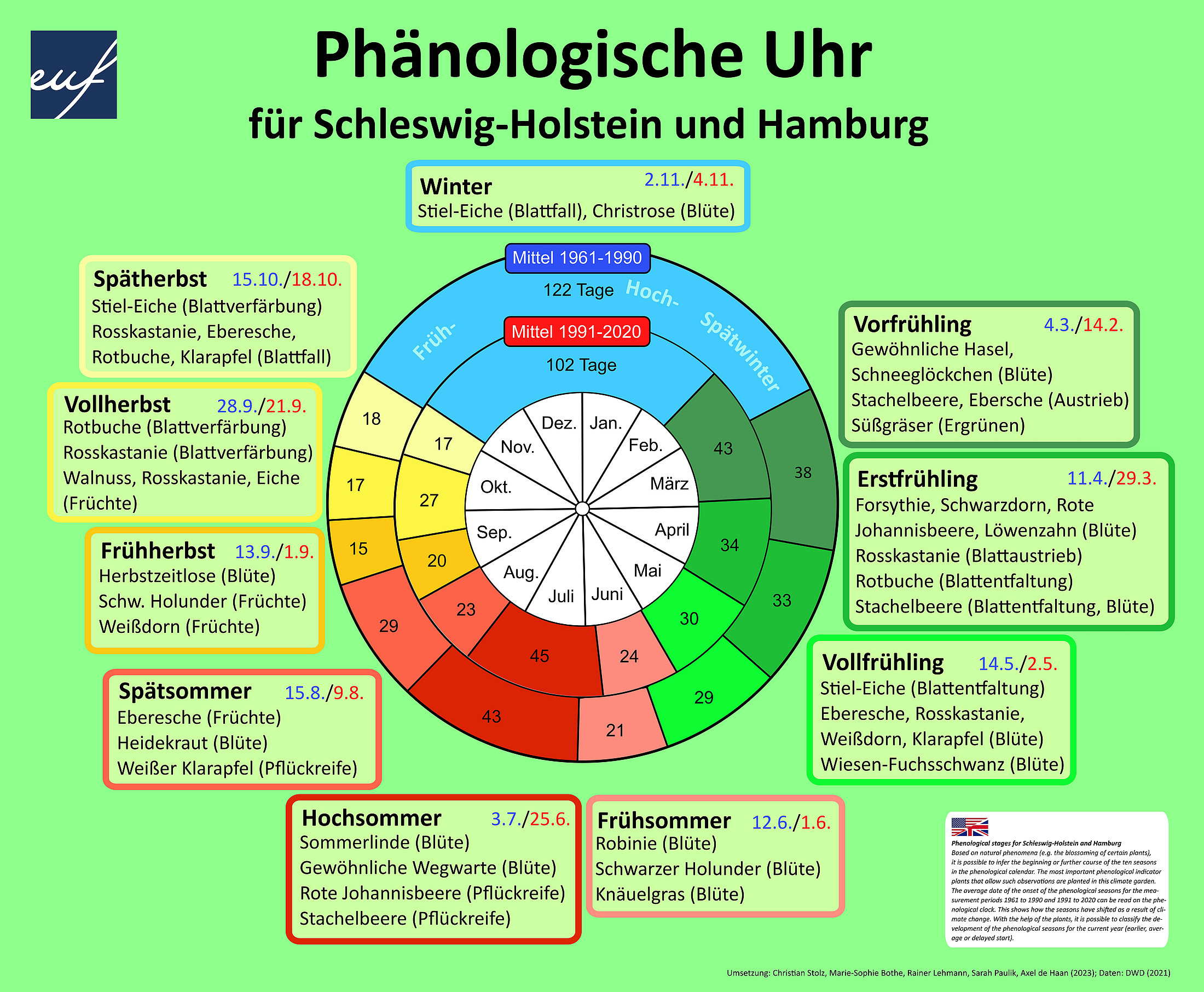 Auf der phänologischen Uhr kann das durchschnittliche Eintrittsdatum der zehn phänologischen Jahreszeiten für die Messperioden 1961 bis 1990 und 1991 bis 2020 für Schleswig-Holstein und Hamburg abgelesen werden. Daraus erschließt sich, wie sich die Jahreszeiten infolge von Klimaveränderungen verschoben haben.